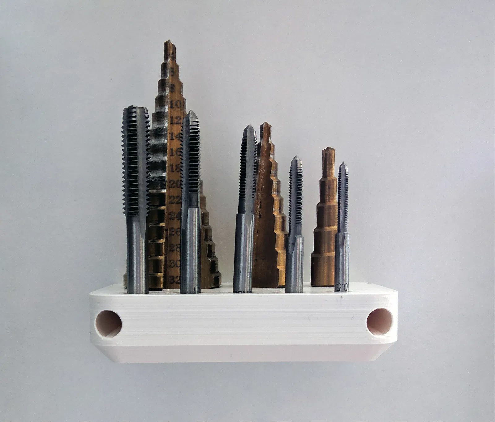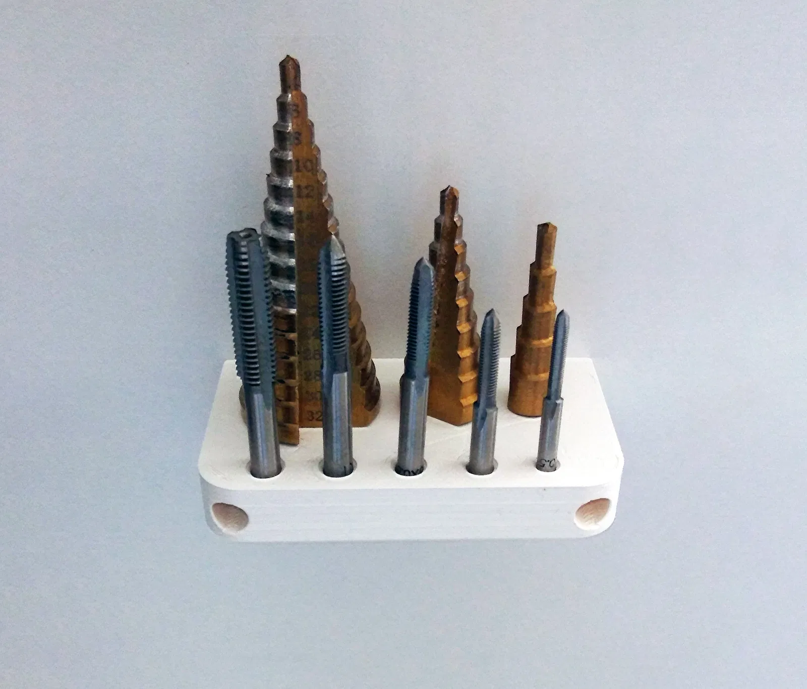 Giá đỡ đơn giản để treo/để step drill 32/20/12mm và bộ taro M8–M3. Bắt tường bằng 2 vít 3,5mm (khuyến nghị 3,5×16mm). In 0,2mm, infill 5%, không cần support, PLA/PHA.