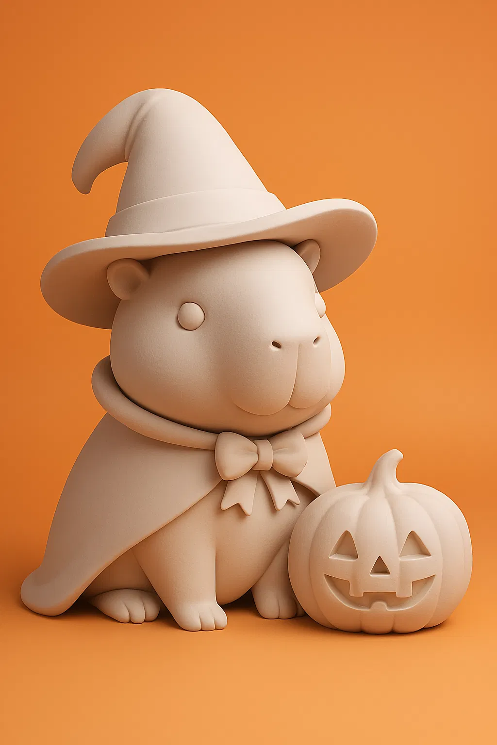 Mẫu Cute Halloween Capybara: capybara mũm mĩm đội mũ phù thủy, khoác áo choàng và có bí ngô jack-o'-lantern đi kèm. Thiết kế ít overhang, đế phẳng chắc chắn, phù hợp in 3D và trưng bày mùa Halloween.