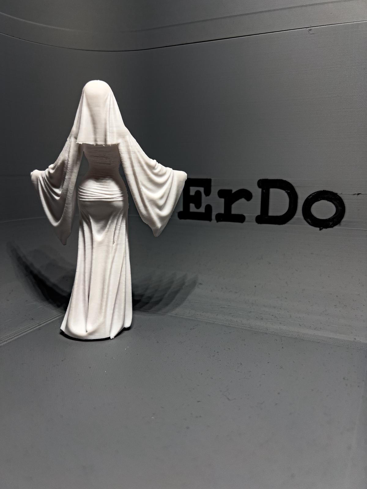 Mẫu 3D “Ghost Girl” mang phong cách tối giản, nhân vật khoác tông trắng toàn thân. Váy ôm dáng tạo silhouette nữ tính, kết hợp tay áo chuông dài mềm mại, hợp in trang trí chủ đề Halloween, spooky và huyền bí.