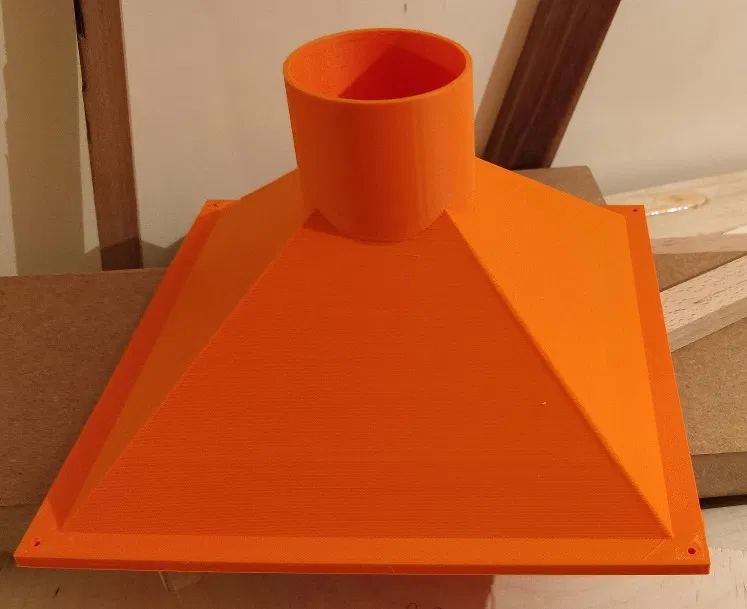 Vì tôi không có một trích xuất chip có kích thước đầy đủ, tôi sử dụng kết nối ống 59,5 mm, làm cho ống linh hoạt 60mm với trình trích xuất của tôi rất vừa khít. Phần miệng là 220mm x 220mm.