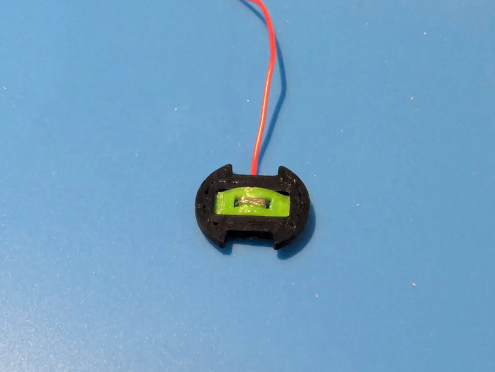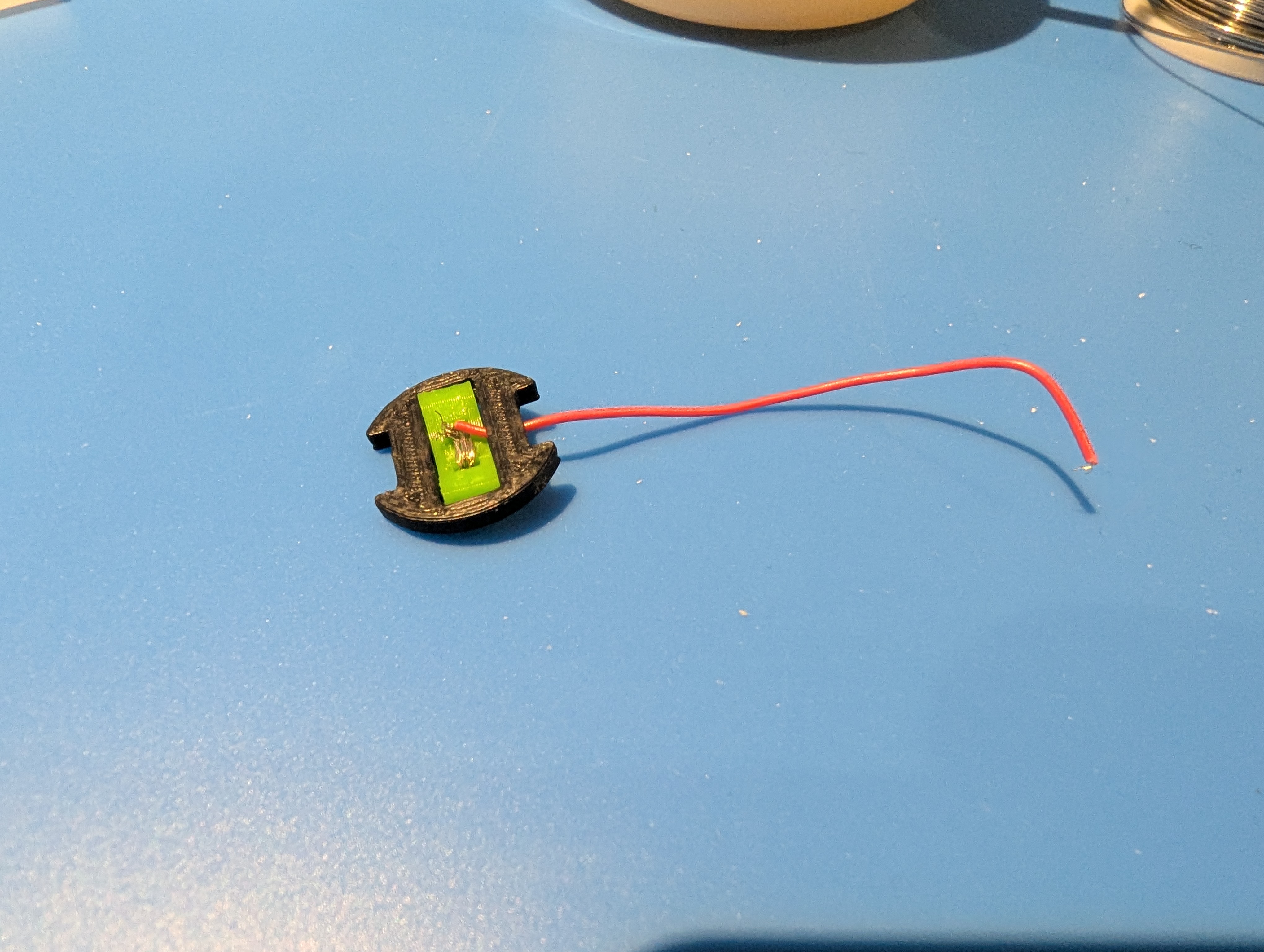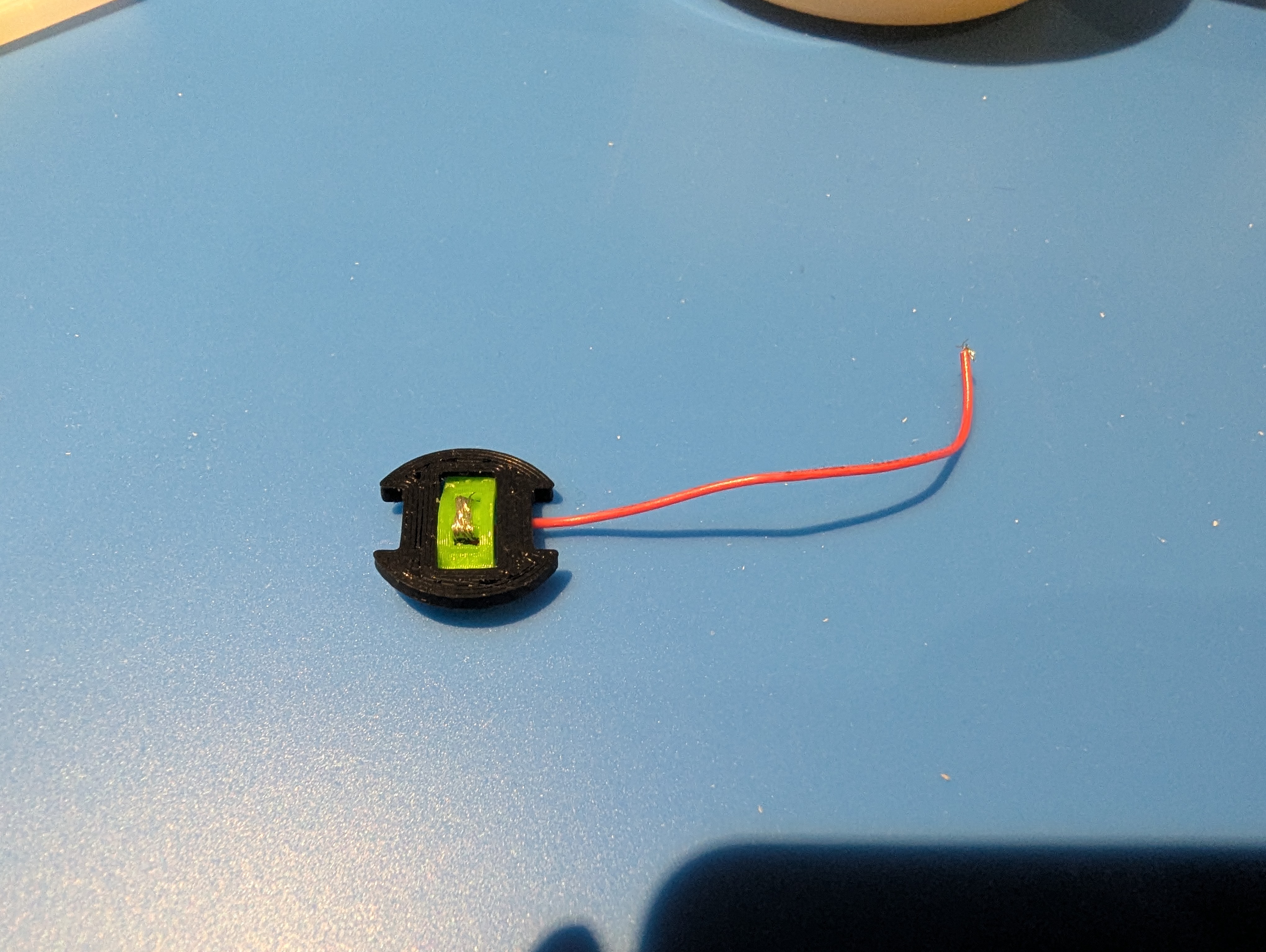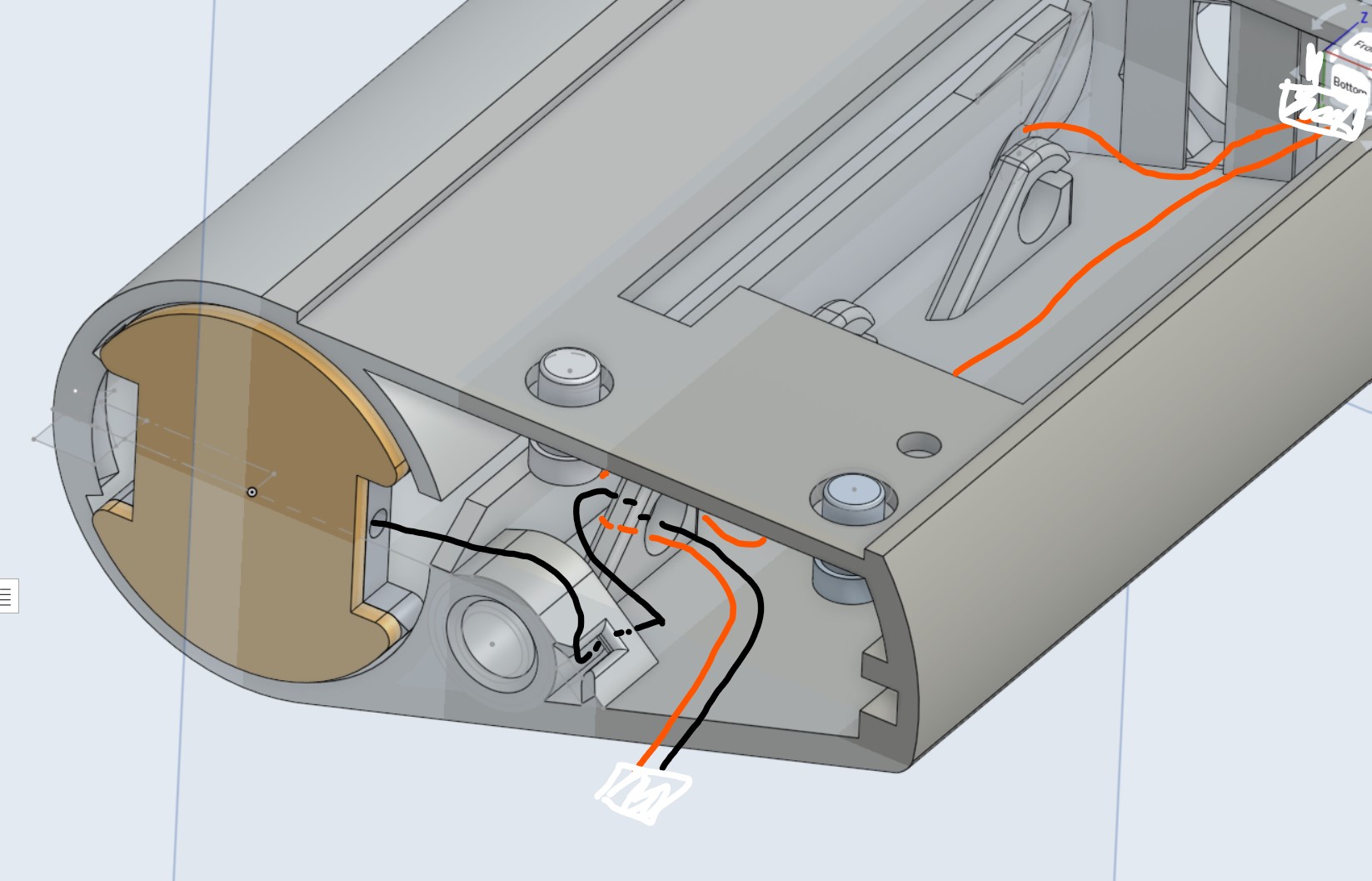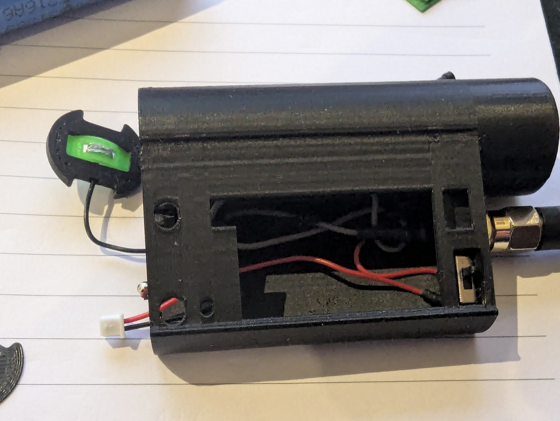 - Cắt dây pin JST theo chiều dài phù hợp. Đầu JST nên nhô ra khoảng 10mm so với đáy case; dây dương đi thẳng lên lỗ switch. Dây âm được đi qua một vòng cạnh heatset insert ở phần đáy, rồi đi vòng quanh insert và vào khoang pin; tại đây bạn sẽ cần đoạn 40mm dây trần (giả sử bạn muốn quấn 3 vòng).