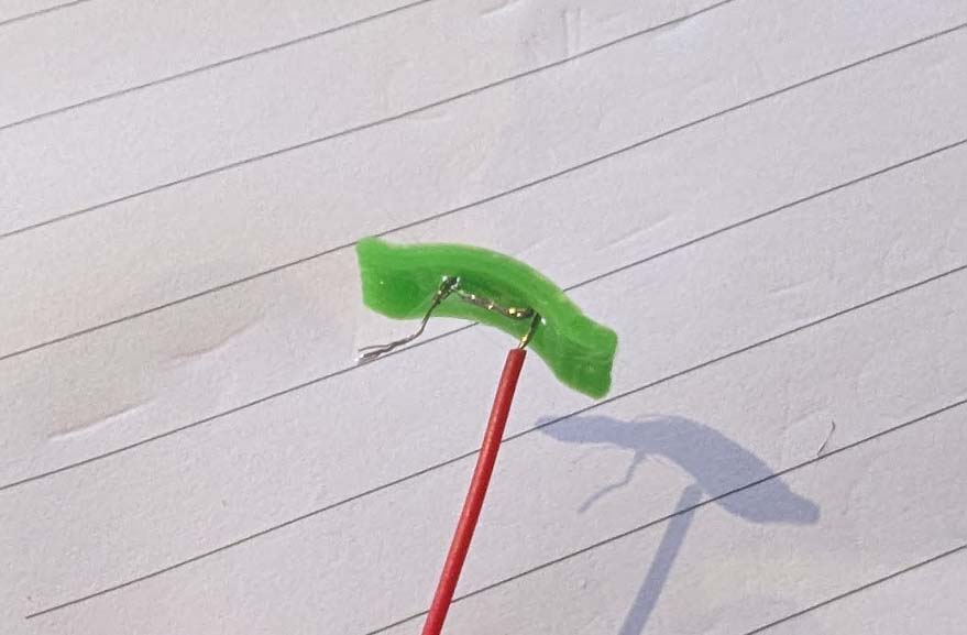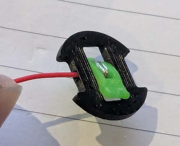 - Xỏ dây qua mặt lõm của battery contact, rồi quấn qua các lỗ. Chừa một ít dây trần ở mặt lõm để xoắn chúng lại với nhau. Ép battery contact vào base.