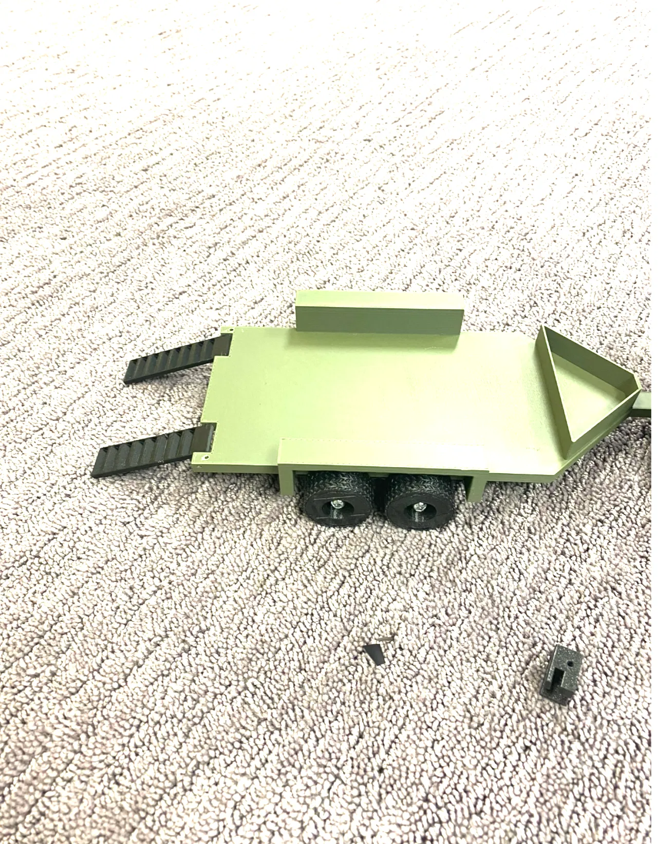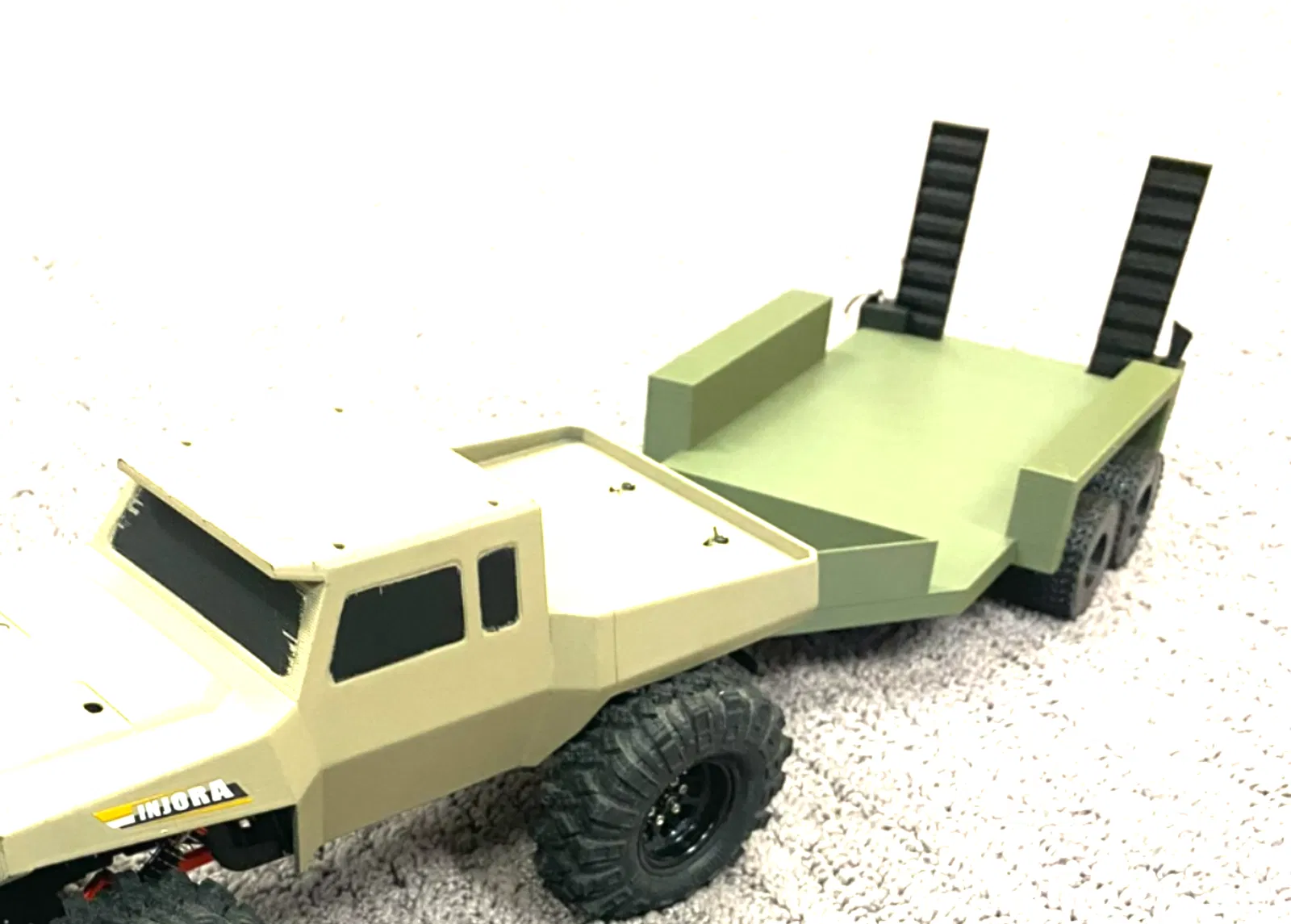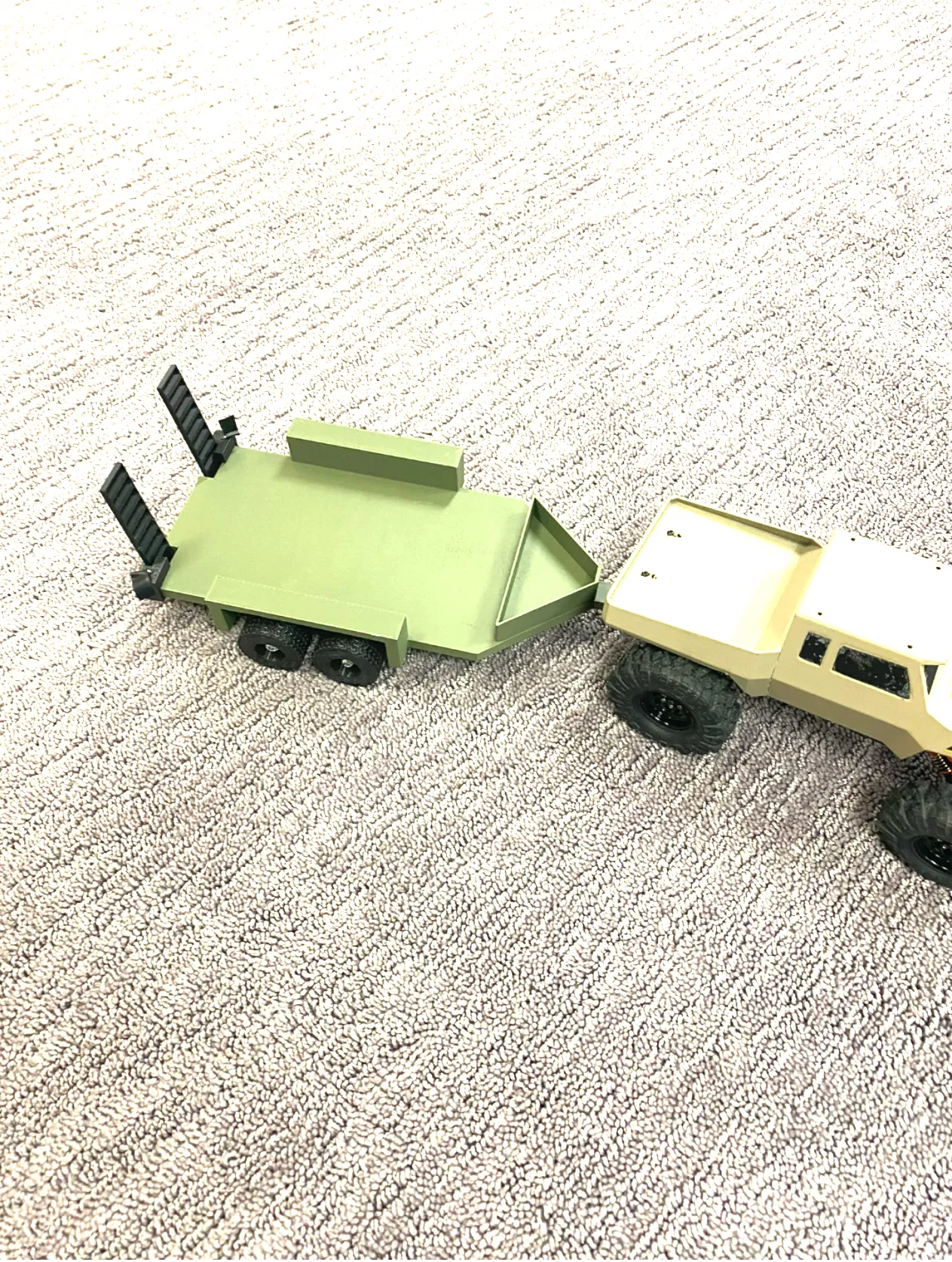 Mẫu trailer dành cho SCX24, hướng dẫn lắp bánh bằng vít 8-32x1. Chốt ramp dùng đoạn sợi PLA cắt ra, còn chặn ramp được giữ bằng thanh kim loại mỏng uốn cong.