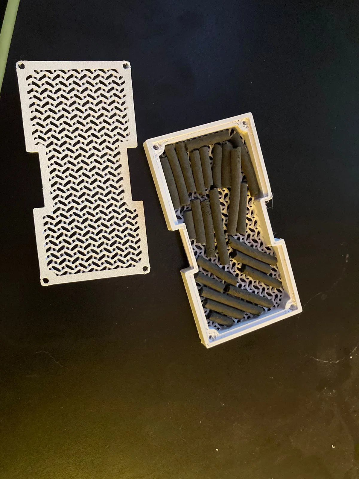 Capsule (vỏ) chứa carbon hoạt tính dạng pellets cho máy lạnh. Lưu ý không dùng carbon dạng bột hoặc hạt mịn vì rất dễ phản ứng; nên dùng pellets đã rửa sạch. Gợi ý in: infill 50%, wall 2, top/bottom 0.