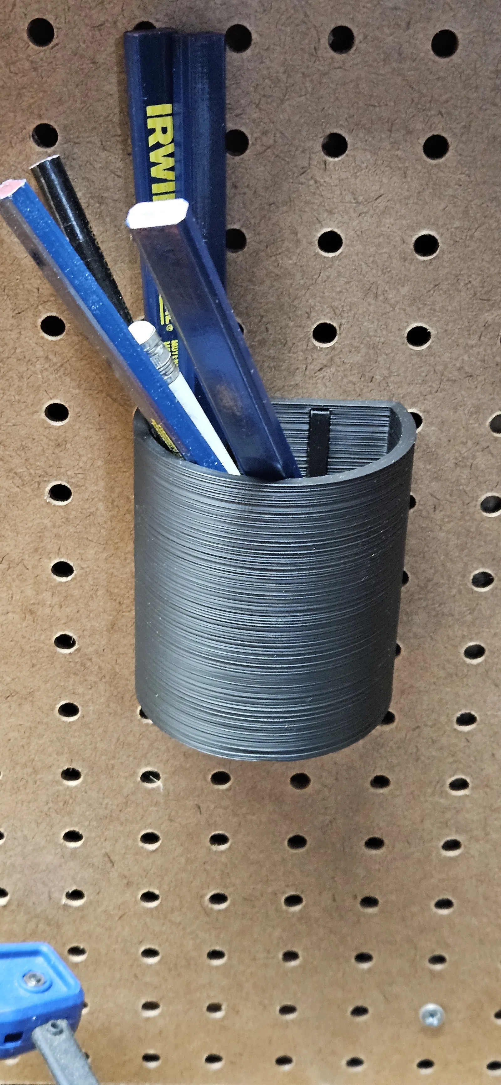 Ly gắn lên pegboard dày 9/16, dùng để đựng bút chì, bút viết hoặc mấy món lặt vặt cho gọn gàng. Thiết kế nhằm dùng chung với bộ pegboard mount của tác giả.