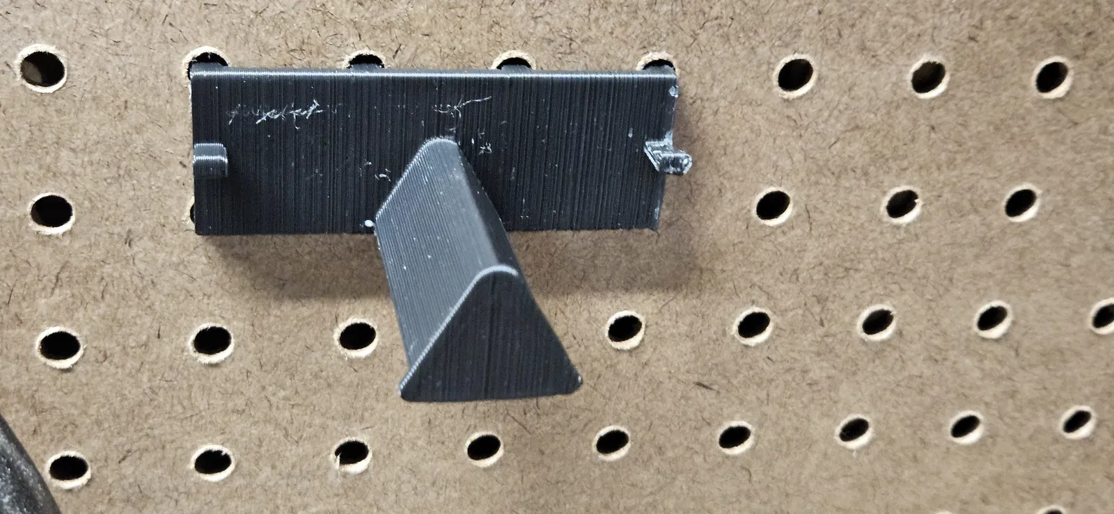 Mẫu này dùng để treo một cặp kính bảo hộ. Mình in theo đúng orientation như trong file (mặt lưng dựng đứng theo chiều cao, phần gọng mũi chĩa thẳng ra ngoài) để tăng độ bền cho các chốt cắm vào pegboard. In kiểu này sẽ cần khá nhiều supports, nhưng giúp tránh gãy chốt.