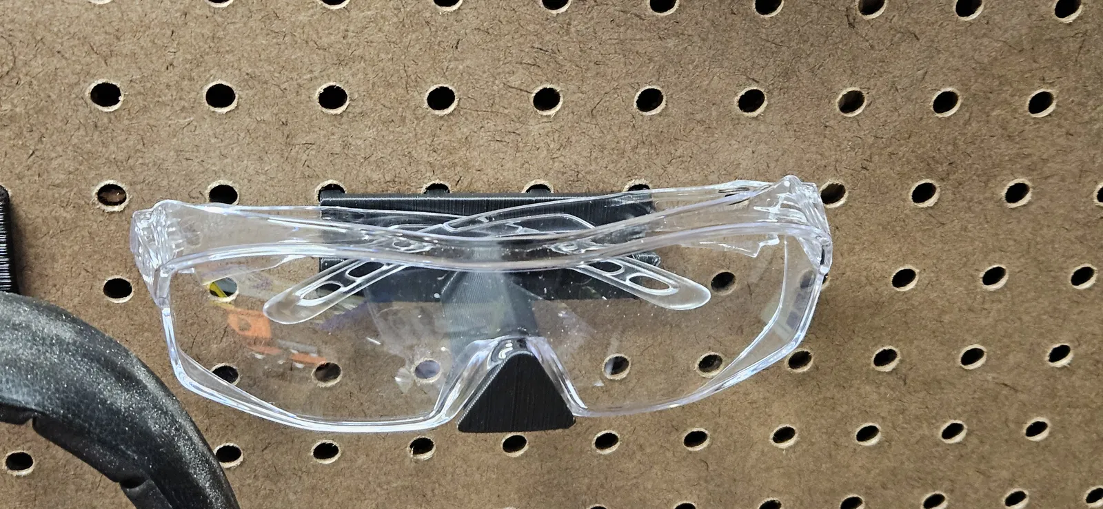 Giá treo cho kính bảo hộ, thiết kế để dùng với pegboard lỗ 9/32" và độ dày 3/16". Khuyến nghị in theo đúng orientation trong file để chốt cắm chắc hơn; sẽ cần nhiều supports nhưng giảm nguy cơ gãy chốt.