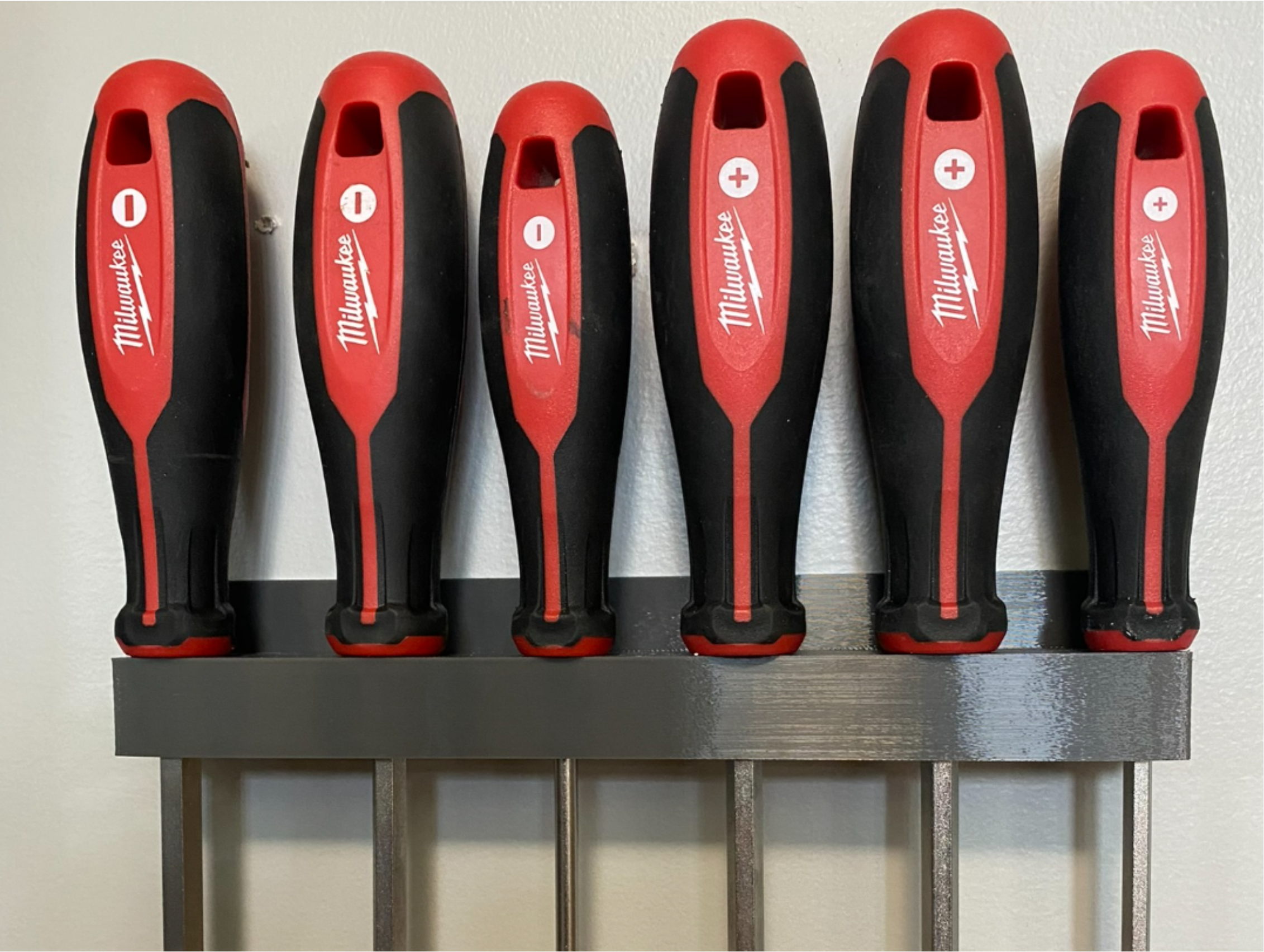 Mẫu giá đỡ tua vít Milwaukee in bằng PLA, thiết kế để giữ vừa tua vít Milwaukee và còn dùng được cho nhiều loại tua vít khác. Phù hợp treo/gắn gọn gàng cho góc làm việc hoặc hộp đồ nghề.