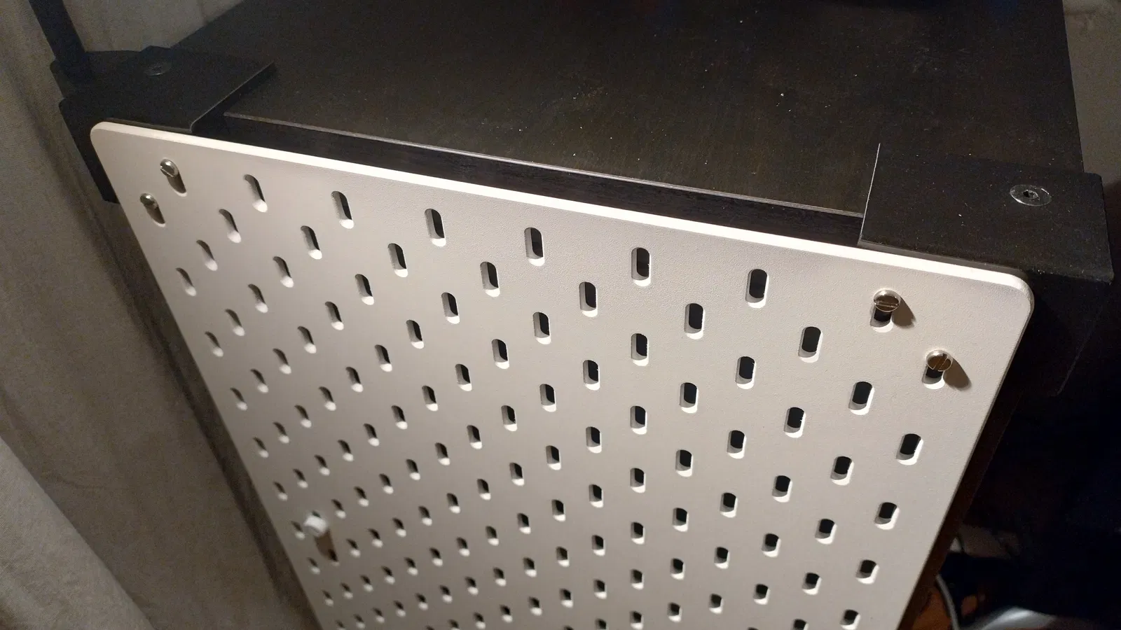 Ngàm góc để gắn bảng SKÅDIS 36x56 cm lên kệ KALLAX. Mẫu có 2 lỗ cỡ M4 để bắt bảng bằng vít (cùng cỡ với vít đi kèm theo bảng, nên bạn có thể dùng luôn) và phía còn lại là dạng lỗ theo hình đai ốc M4 (dù lỗ vít rộng đúng 4 mm nên vít có thể tự ren vào). Chiều dài vít lý tưởng là 25 mm. Bản ngàm bám vào KALLAX bằng chính con vít chính dùng để siết chặt phần dọc và phần ngang của ngàm với nhau. Vì vậy không cần khoan hay chỉnh sửa gì trên KALLAX hoặc SKÅDIS. Ngàm được tạo hình theo các góc nên khi lắp sẽ ôm sát, phẳng khít.