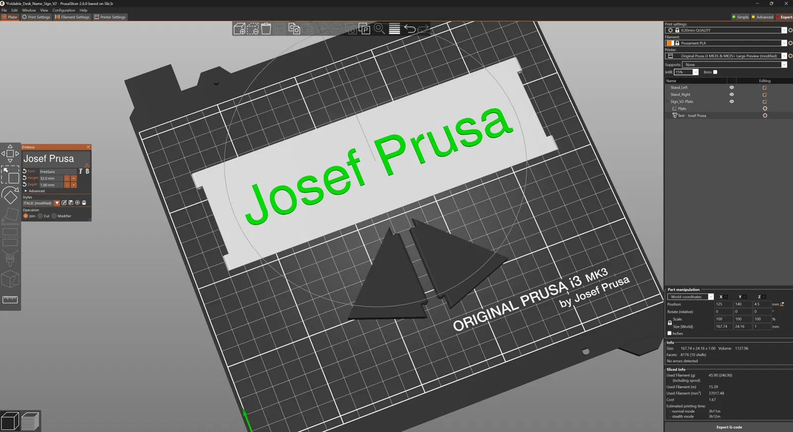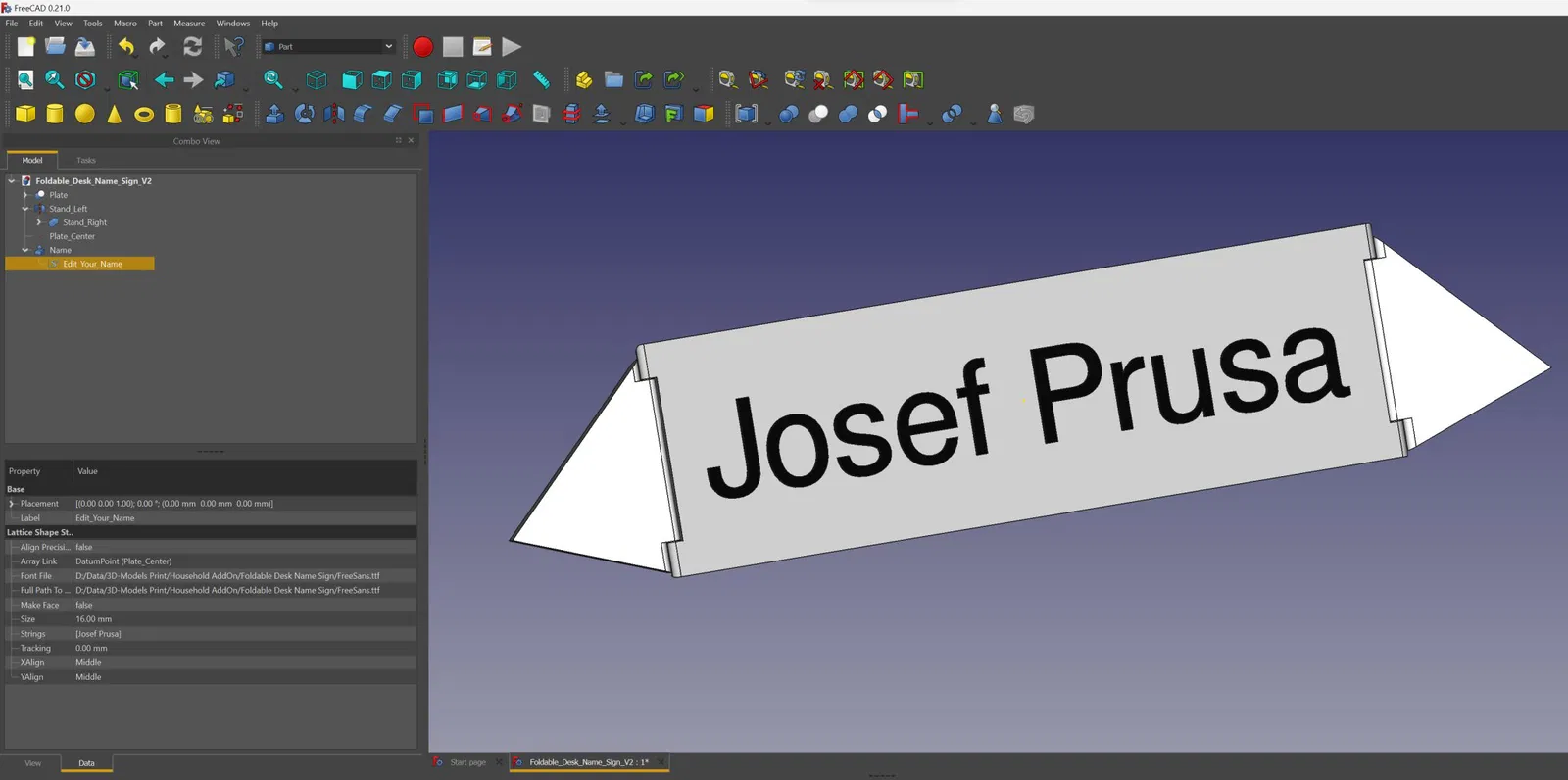 Cách dễ nhất để đặt tên của bạn lên biển hiệu là sử dụng eSlicer. Sử dụng tệp dự án 3MF. Bạn cũng có thể sử dụng tệp FreeCAD đính kèm. Với FreeCAD, chỉ cần chỉnh sửa chuỗi trong dấu ngoặc của đối tượng “Edit_Your_Name” và chọn phông chữ của bạn. Tôi đã sử dụng FreeSans.