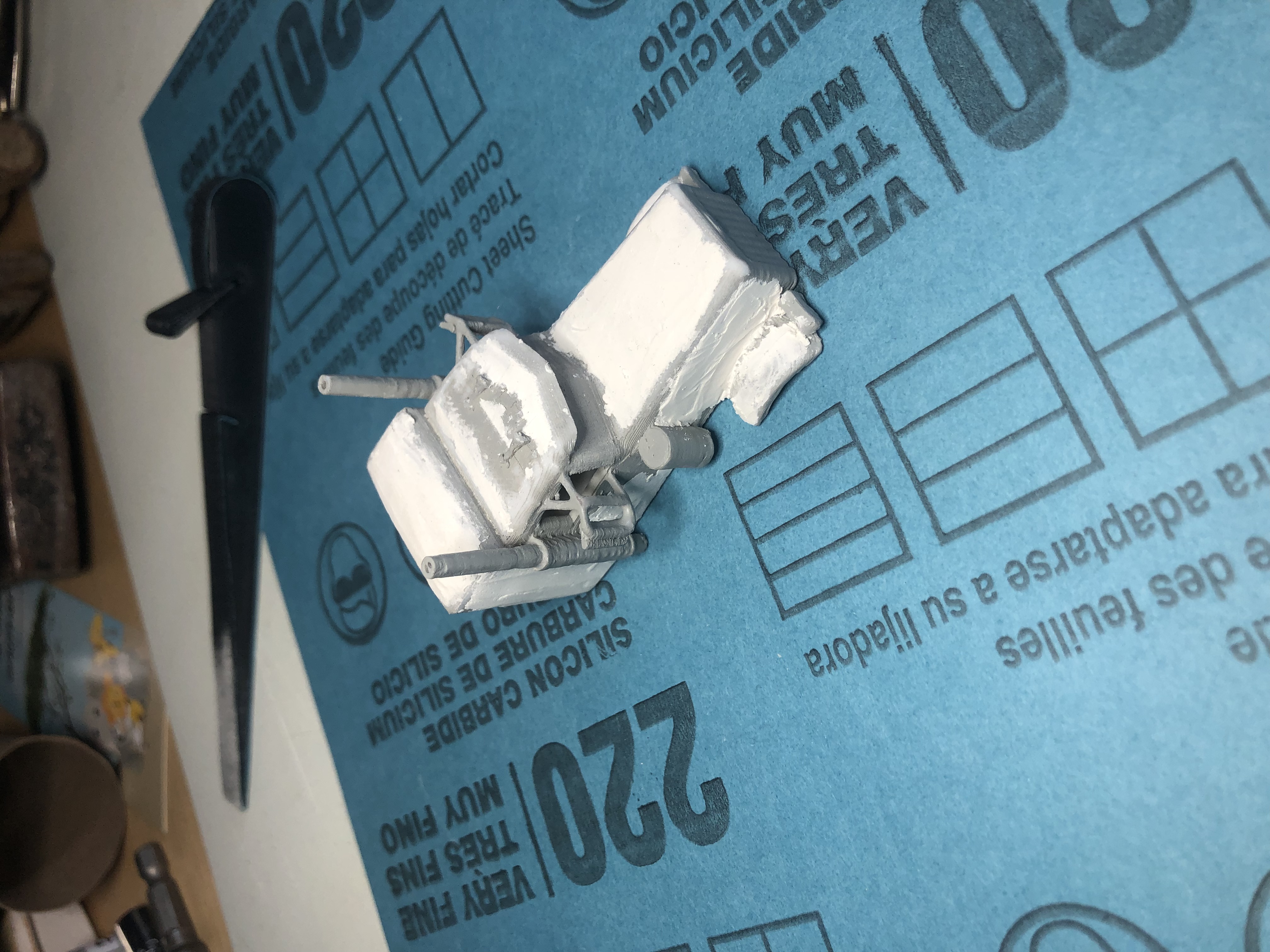 Chiếc xe này cũng là model đầu tiên mình dùng wood filler. Mình nghĩ từ giờ về sau chắc sẽ dùng khá thường xuyên, vì bề mặt mịn cực kỳ quan trọng để làm model nhìn thật. Tuy vậy, cái này hoàn toàn tuỳ chọn. Sơn thì chỉ là sơn acrylic đơn giản, và thay vì dùng cây sharpie bạc như thường lệ, mình dùng sơn bạc cho model này. Dùng sơn bạc giúp quét vào những chỗ hẹp dễ hơn sharpie, và nhìn kiểu chrome hơn. Mình vẫn dùng sharpie bạc làm lớp màu nền cho đèn clearance (đèn nóc) và đèn pha. Mình tô nền bạc rồi dùng sharpie màu cam và màu vàng tương ứng. Logo Peterbilt trên lưới tản nhiệt (grill) thì mình dùng sharpie đỏ.
