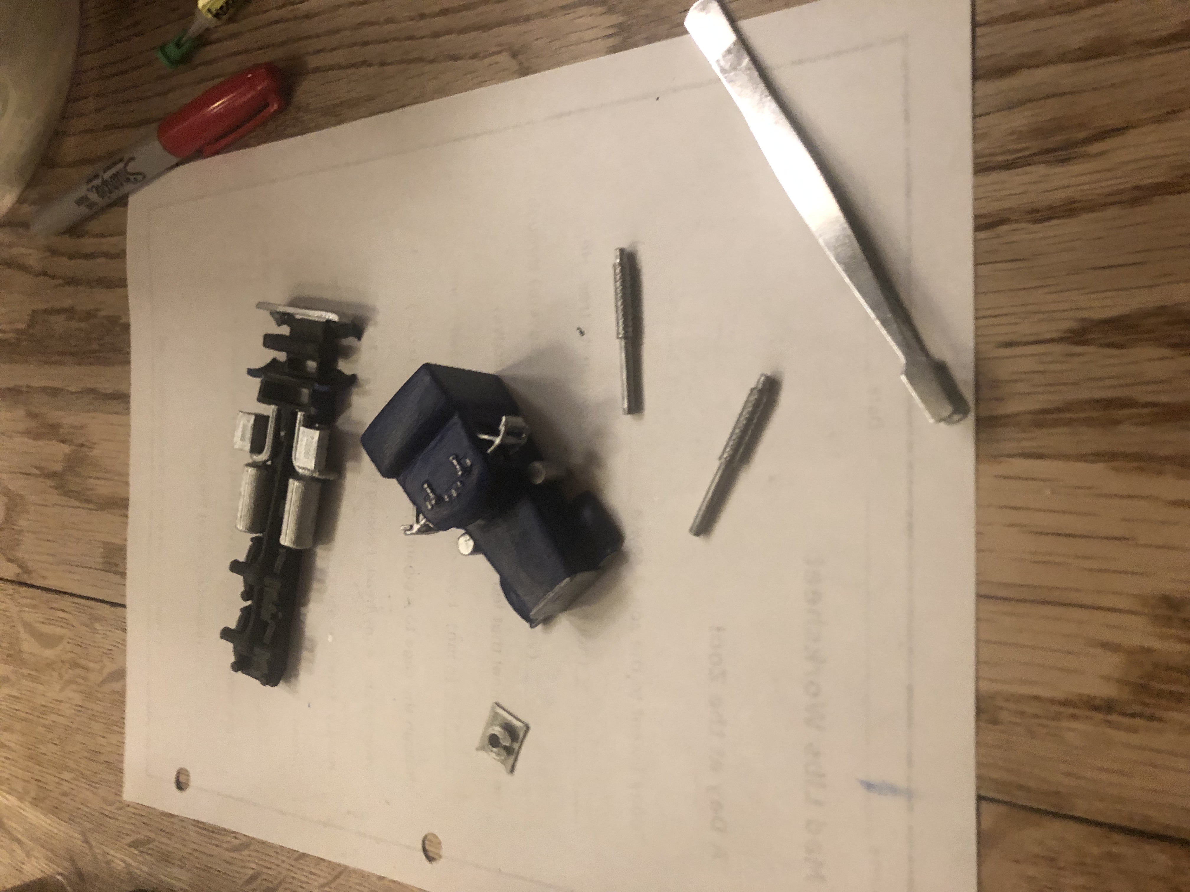 Trục bánh (axles) là kiểu truyền thống của mình: kẹp giấy (paperclips) duỗi thẳng, dùng kìm có phần cắt dây (wire cutters) bấm nhẹ để tạo nhám, rồi superglue vào bánh xe.