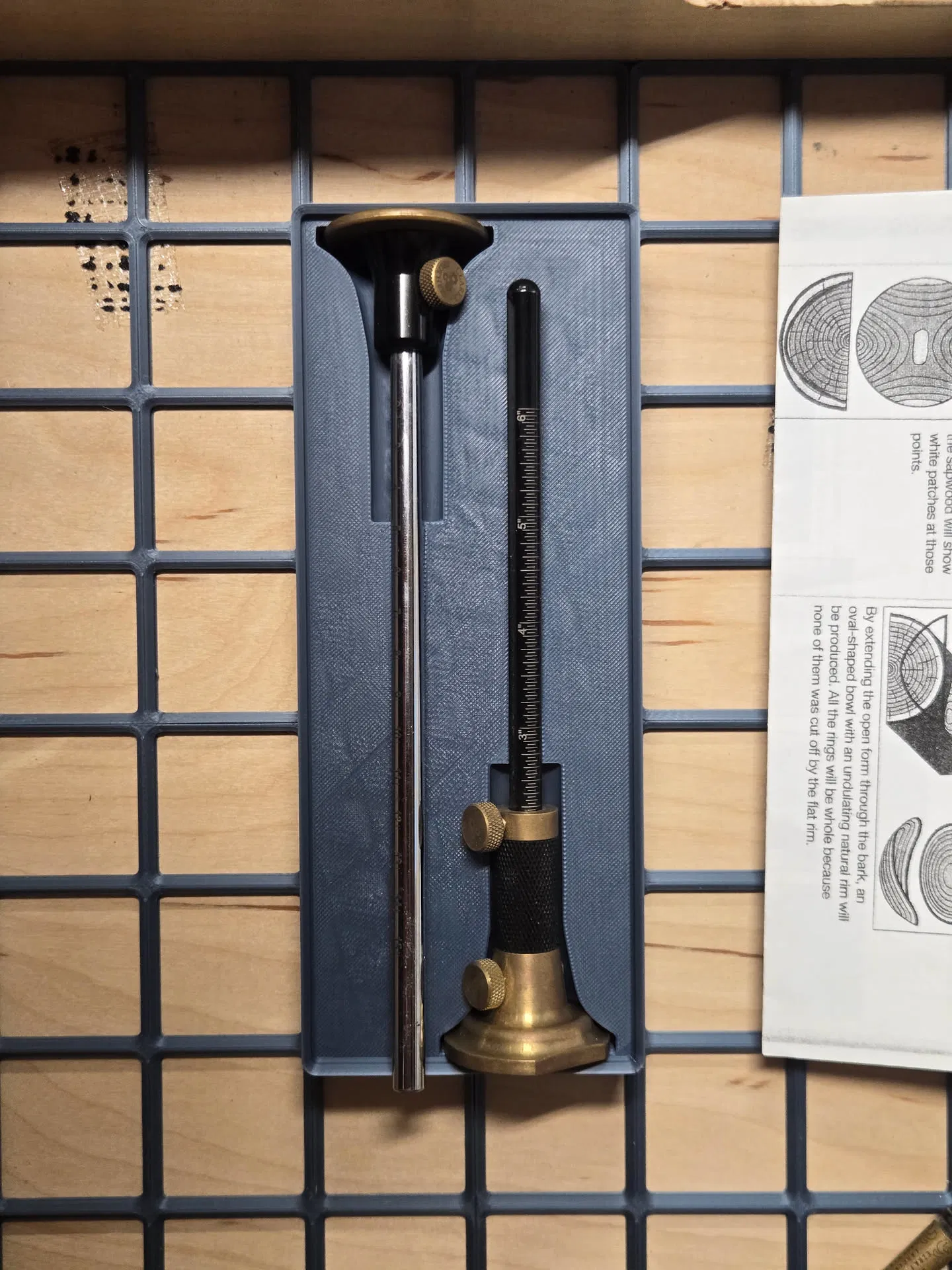 Cái khay giữ 2 cái thước đo bánh xe dành cho ngăn kéo Gridfinity. Chứa 2 thước đo bánh xe (vừa với thước của Clarke Bros, nhưng có thể xài được với mấy loại khác luôn) đặt xéo để chứa mấy cái thân dài hơn. (Và để vừa với cái đế 225mm của tui). Dành cho thước đo dấu bánh xe trong mộc.