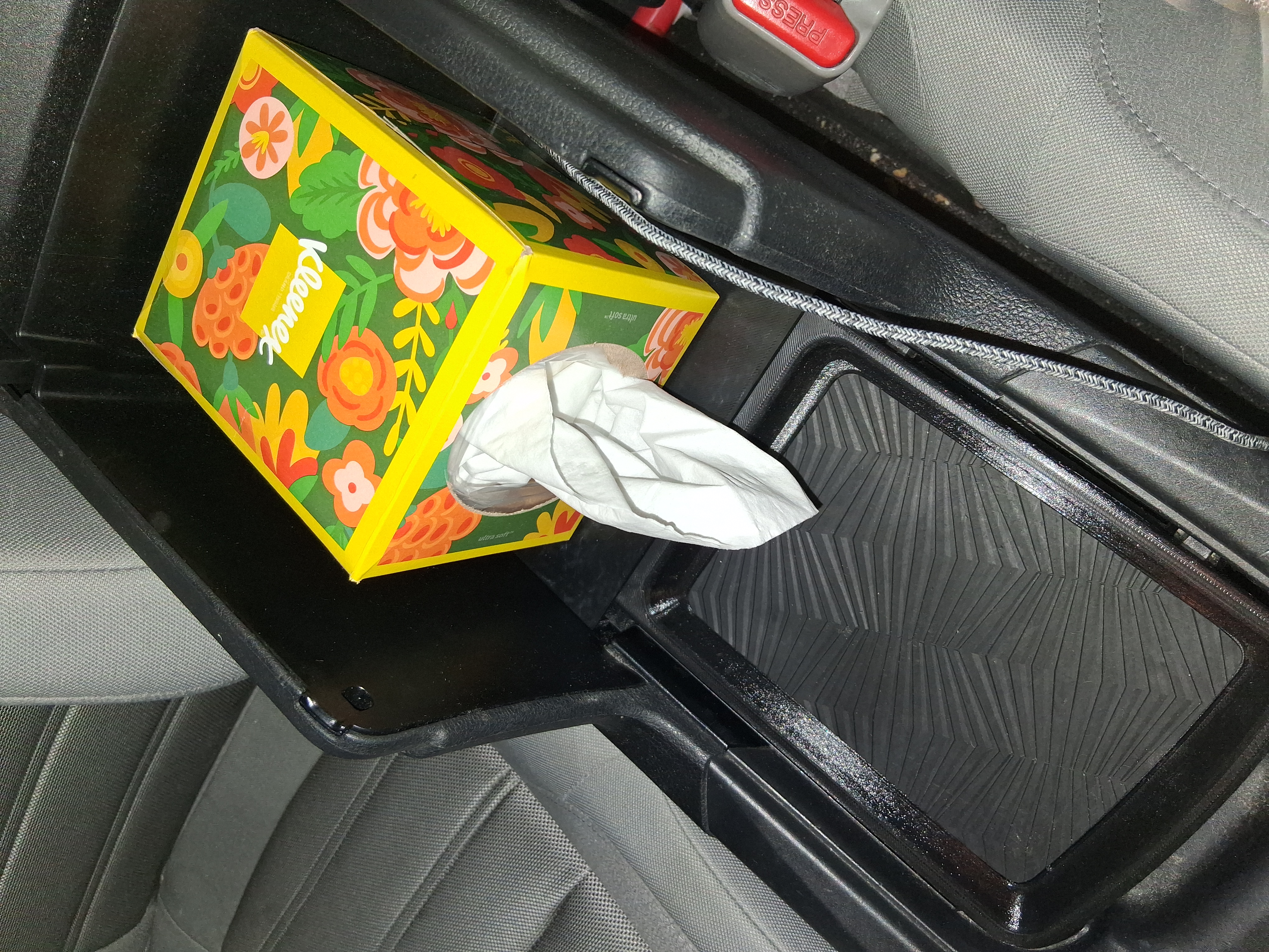 Mô hình kệ bổ sung được cung cấp để che lỗ và đỡ bất cứ thứ gì cất dưới chỗ để tay. Trong trường hợp này là một hộp khăn giấy. Khay trượt di chuyển bên dưới kệ nên không cần lấy đồ trên kệ ra.
