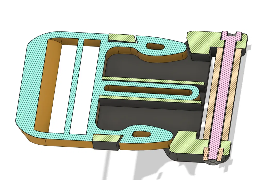 Cái này sẽ cần một con ốc lục giác chìm M3x40 (CHC screw) và một con đai ốc (nut), để lắp vào thay cho cái kẹp bị gãy hoặc bộ điều chỉnh dây đeo mà không cần phải tháo chỉ may của dây đeo, chỉ cần lắp nó vào vì nó được tách thành nhiều phần. Phần còn lại là bộ phận điều chỉnh, dành cho dây đeo rộng 30mm.
