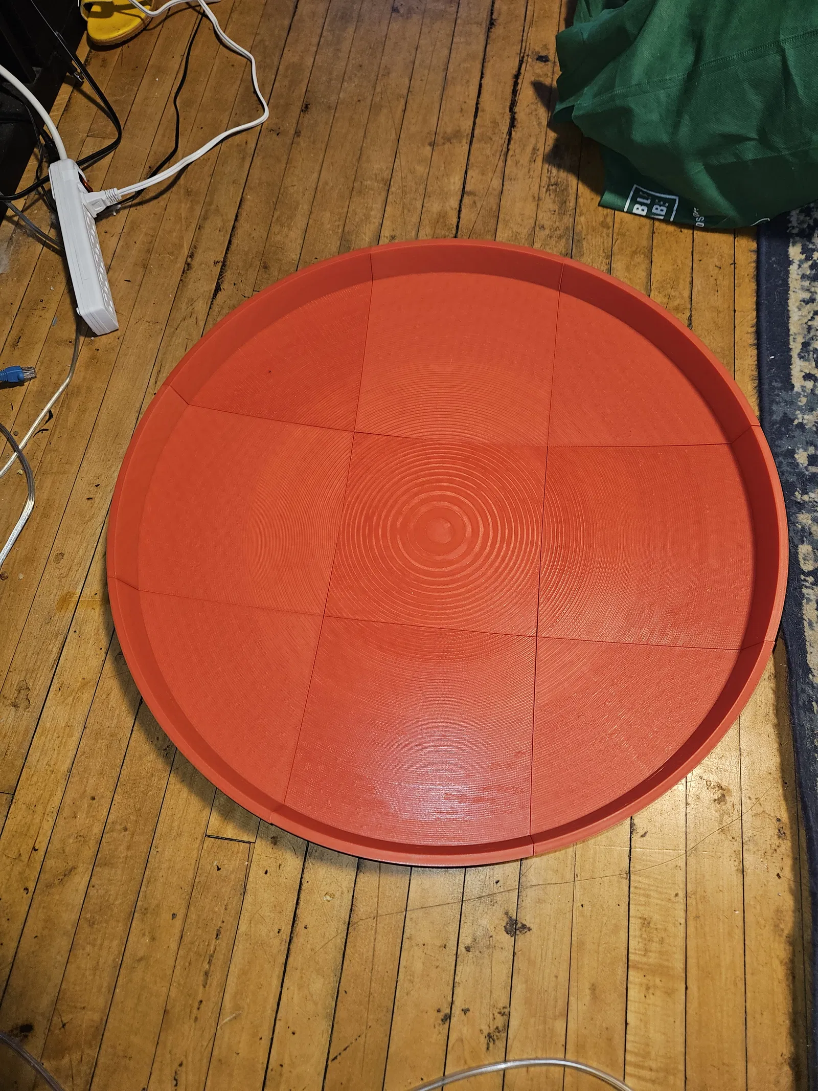 Cái này đường kính 300mm, chia làm 9 ô, với ô ở giữa là 200mm mỗi cạnh. Có thêm các lẫy 10mm (2 cái mỗi mặt ghép nối) nên máy in của bạn phải in được 220mm mỗi cạnh nha. Tui có in mấy mảnh trên cái FlashForge A5M với mấy mảnh trên cái Elegoo Centauri Carbon. Mấy cái này bự nên in cũng tốn thời gian à. Có thể in ở kích thước 95% cho mấy bạn có bàn in 200mm, mà tui chưa thử nha.