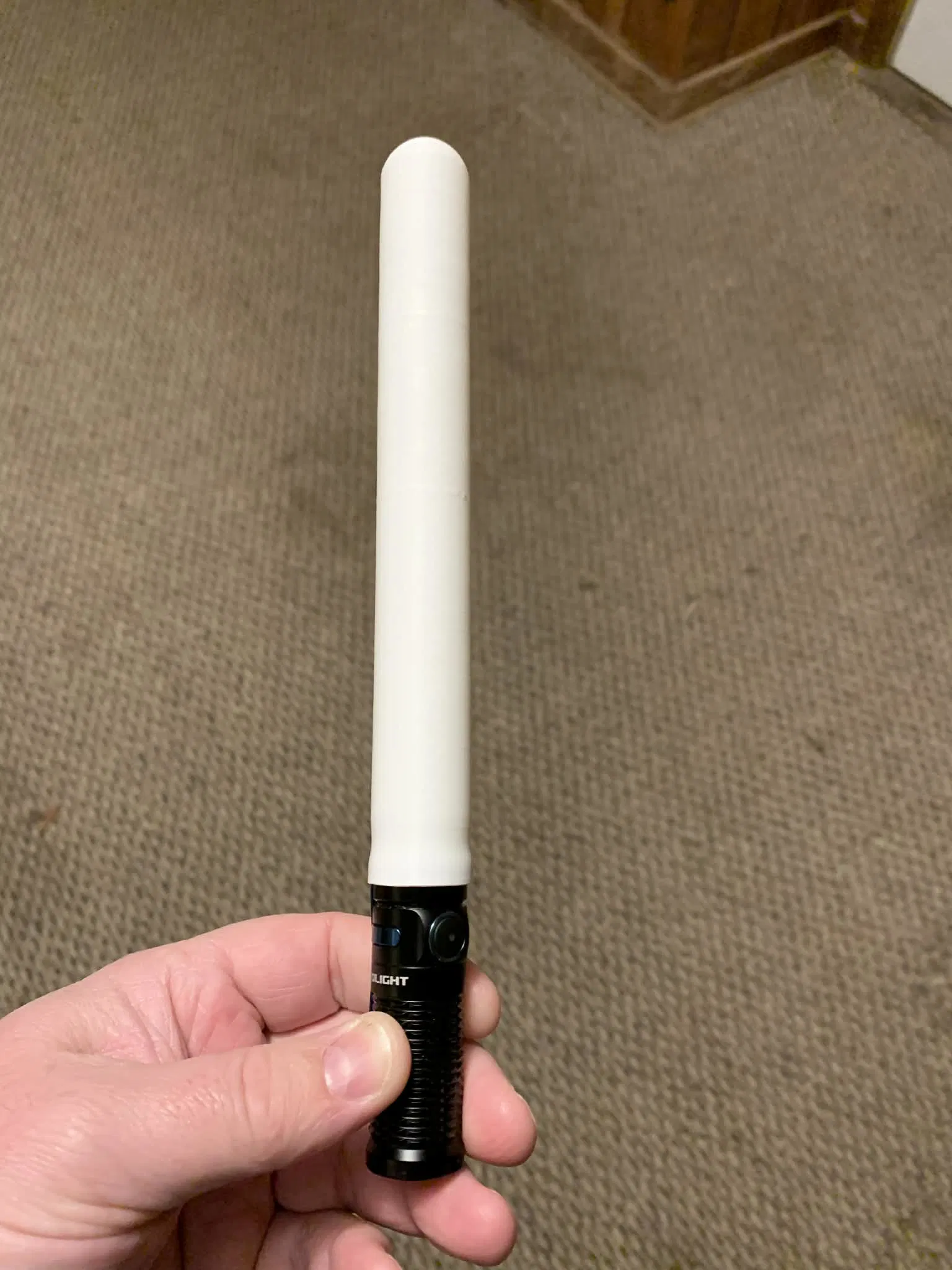 Diffuser dài khoảng 4x chiều dài đèn pin cho Olight Baton 3 & 4 (có thể hợp với bản Pro nhưng chưa test). In PLA với support thường; cần heat form phần miệng để ôm khít và khóa chắc vào đèn.