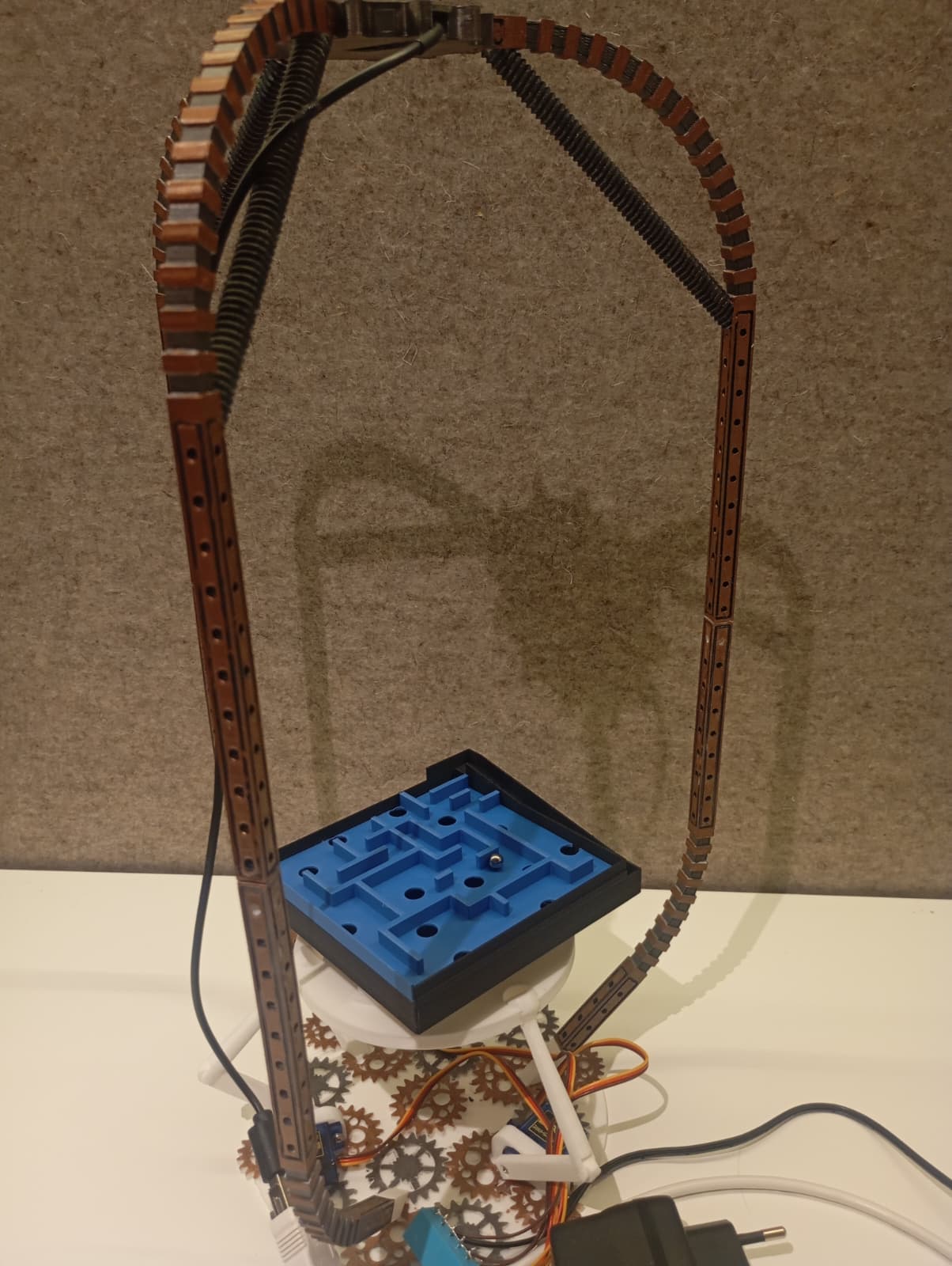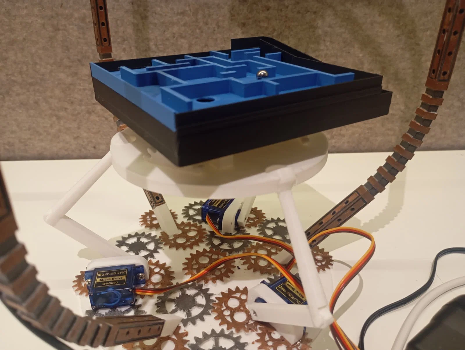 Mình có làm thêm các attachment để có một tấm plate trơn và một tấm maze đặt phía trên, nhằm cân bằng một quả bóng hoặc điều khiển bóng đi qua mê cung.