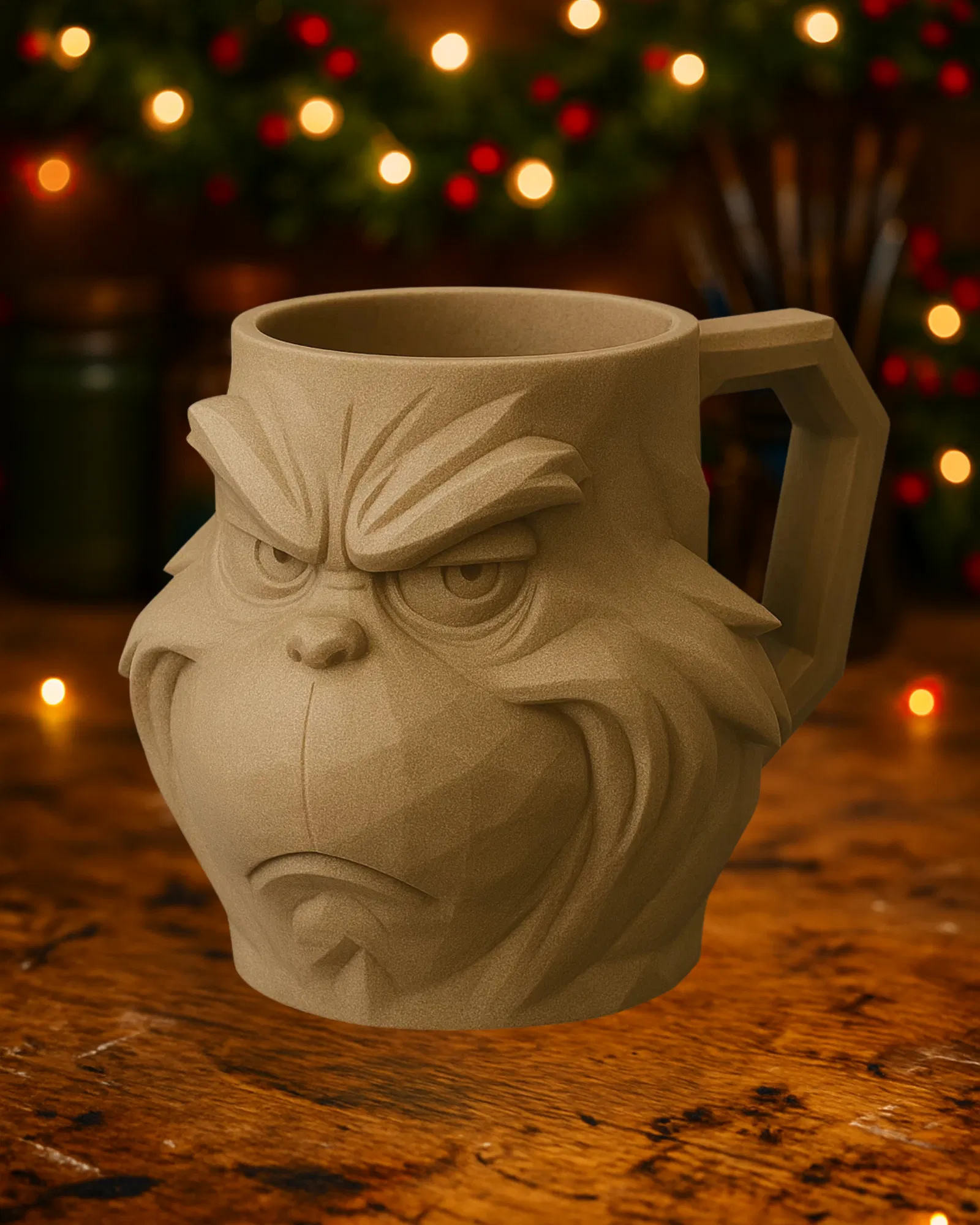 Mẫu ly (mug) điêu khắc lấy cảm hứng từ The Grinch, tái hiện gương mặt khó ở “huyền thoại” với đường nét khuôn mặt đậm và chi tiết sắc sảo. Rất hợp làm đồ trang trí Noel hoặc quà tặng mùa lễ.