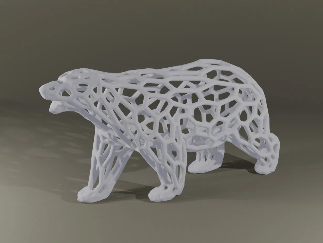 Mẫu Polar Bear Voronoi là tượng gấu Bắc Cực theo phong cách voronoi, tạo bề mặt dạng lưới độc đáo. Khi in, nên dùng tree support (ngưỡng 30°) và thêm brim để bám bàn in tốt hơn.