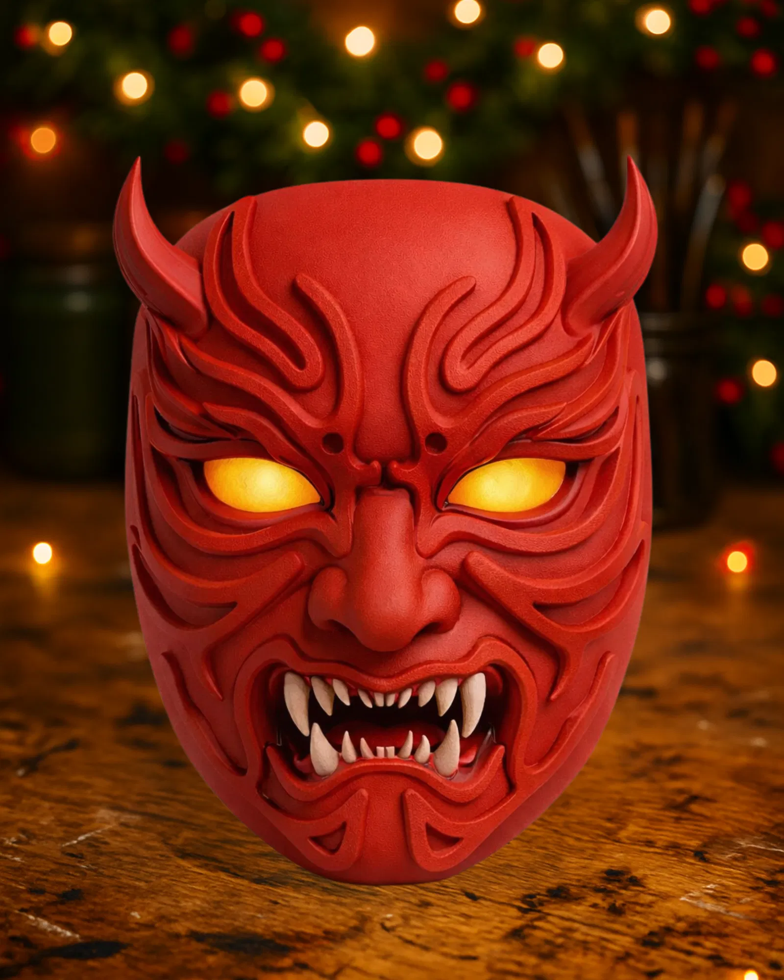 Một chiếc mặt nạ quỷ đỏ được điêu khắc cực kỳ chi tiết, lấy cảm hứng từ thẩm mỹ Oni truyền thống của Nhật Bản.