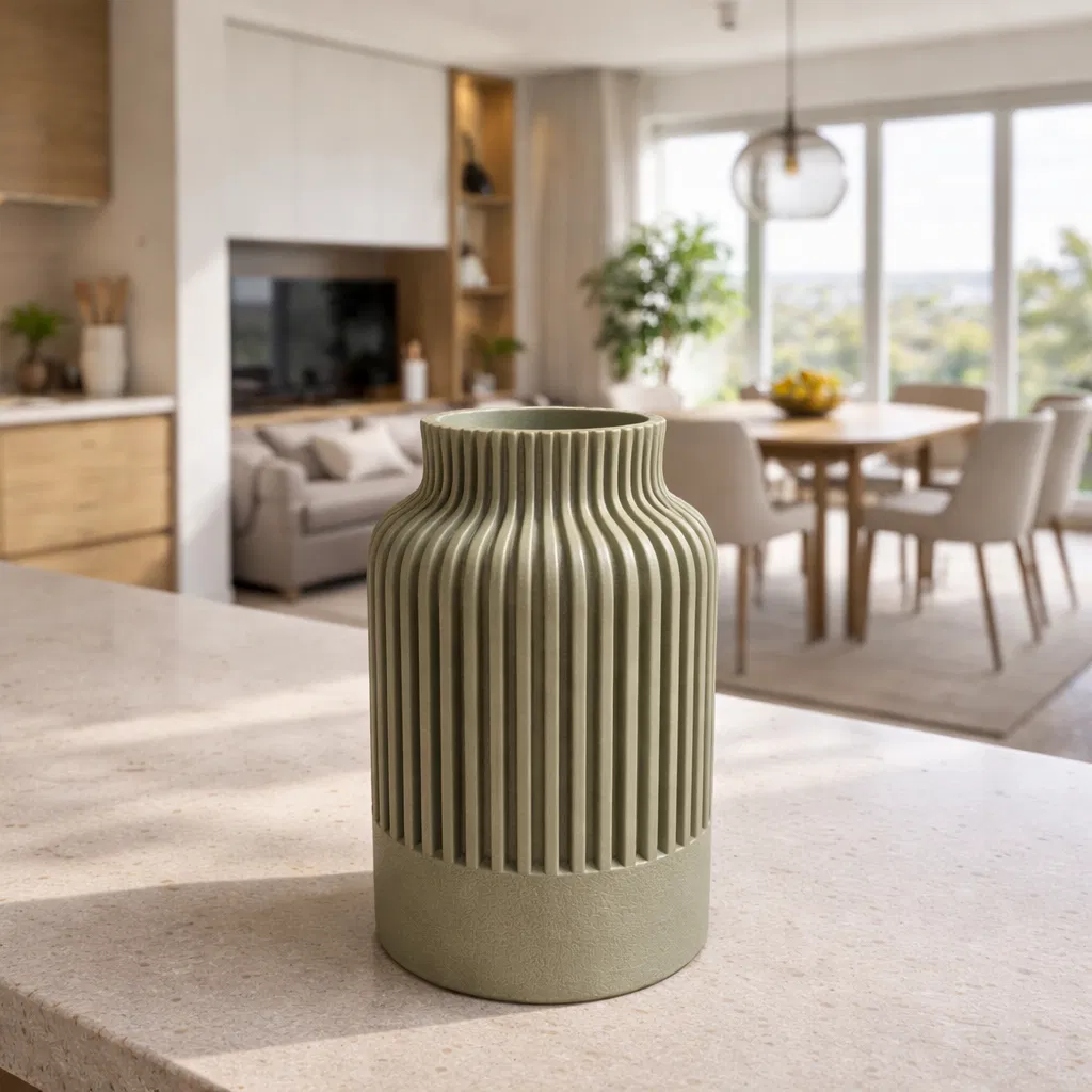 Mẫu bình hoa gân sọc hiện đại này được thiết kế như một điểm nhấn trang trí tinh tế cho không gian nội thất đương đại.