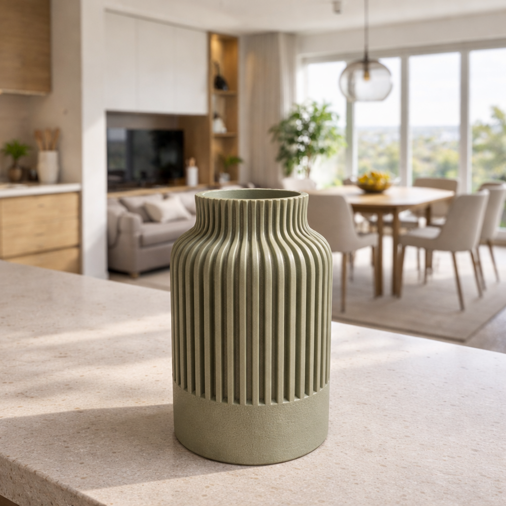 Bình dùng đẹp với hoa khô, cây giả, hoặc để trưng riêng như một món decor trên bàn, kệ hay tủ sideboard. Nhờ hình học đã được tối ưu, mẫu in dễ và không cần supports.