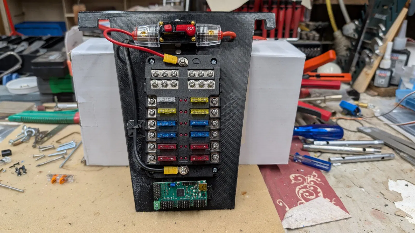 Để cất gọn toàn bộ phần điện tử cho gọn gàng hơn, mình đã thiết kế tấm board này. Nhờ vậy có thể cố định mọi thứ ngăn nắp và cũng dễ tháo ra khi cần.