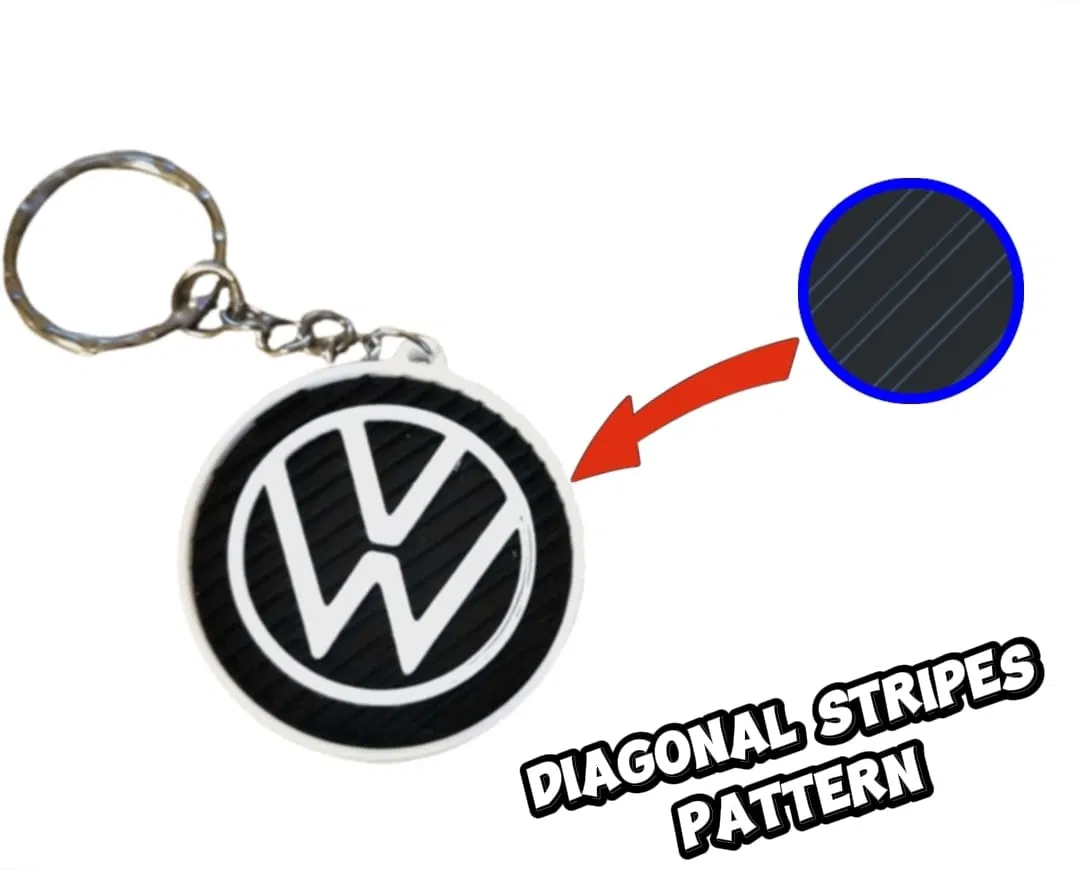 Móc khóa Volkswagen với họa tiết sọc chéo. File được tách 2 phần để tiết kiệm filament khi in đổi màu. Nhớ thay filament từ đen sang trắng ở layer 12: nền in đen, logo phía trên in trắng.