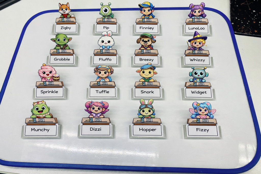 Sơ đồ chỗ ngồi 3D dạng nam châm được tạo ra để dùng trong lớp học. Chỉ cần dán một viên nam châm vào mỗi khung quân cờ, làm các hình nhân bằng bìa carton rồi gắn vào khung là xong — bạn sẽ có một sơ đồ chỗ ngồi nhìn rất trực quan và có thể chỉnh sửa bất cứ lúc nào.