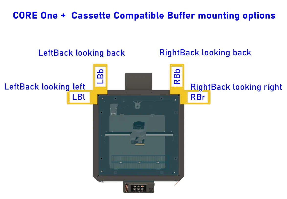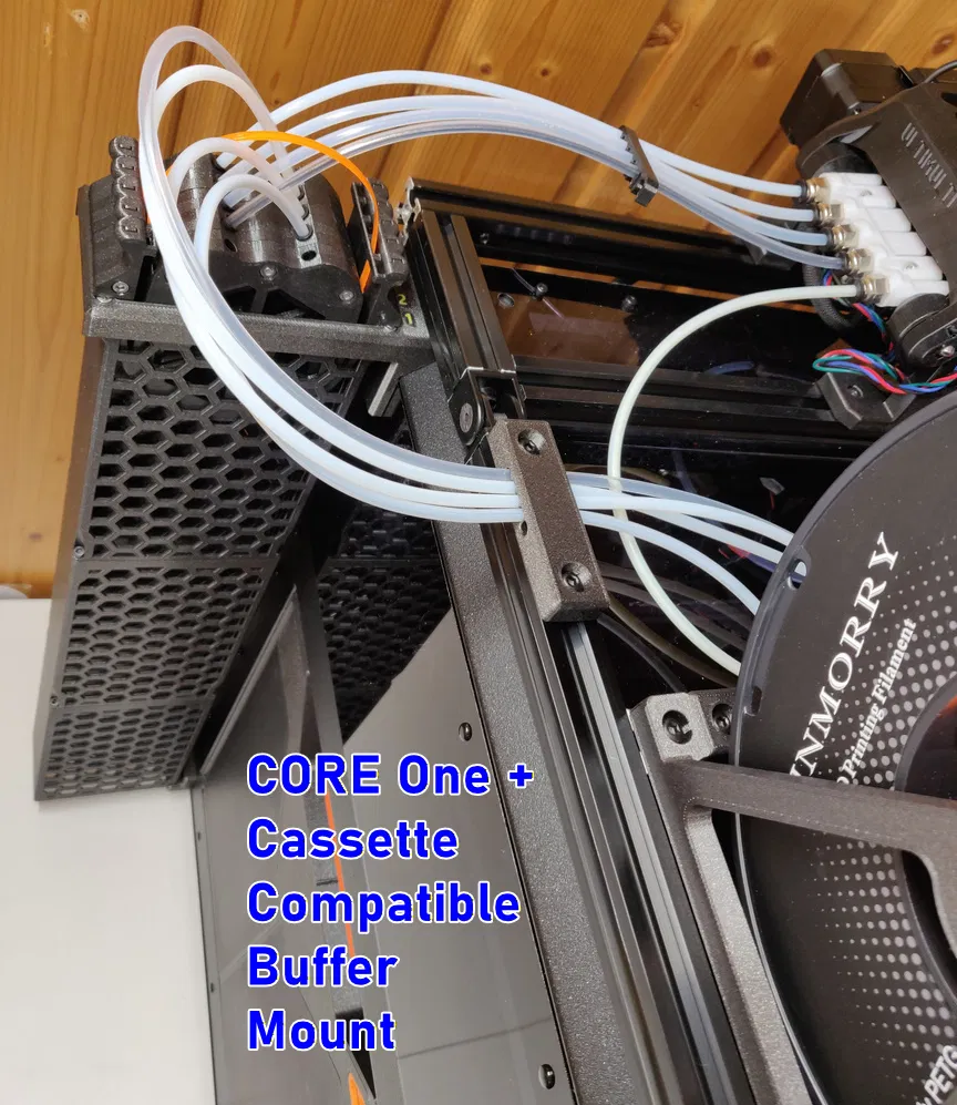 Bản adaptation cho MMU3 Cassette Compatible Buffer dùng với Prusa CORE One/C1+. Hỗ trợ retract filament từ MMU3 lên tới 950 mm, không cản thao tác, tháo nhanh bằng 4 ốc. Có 4 tùy chọn vị trí gắn.