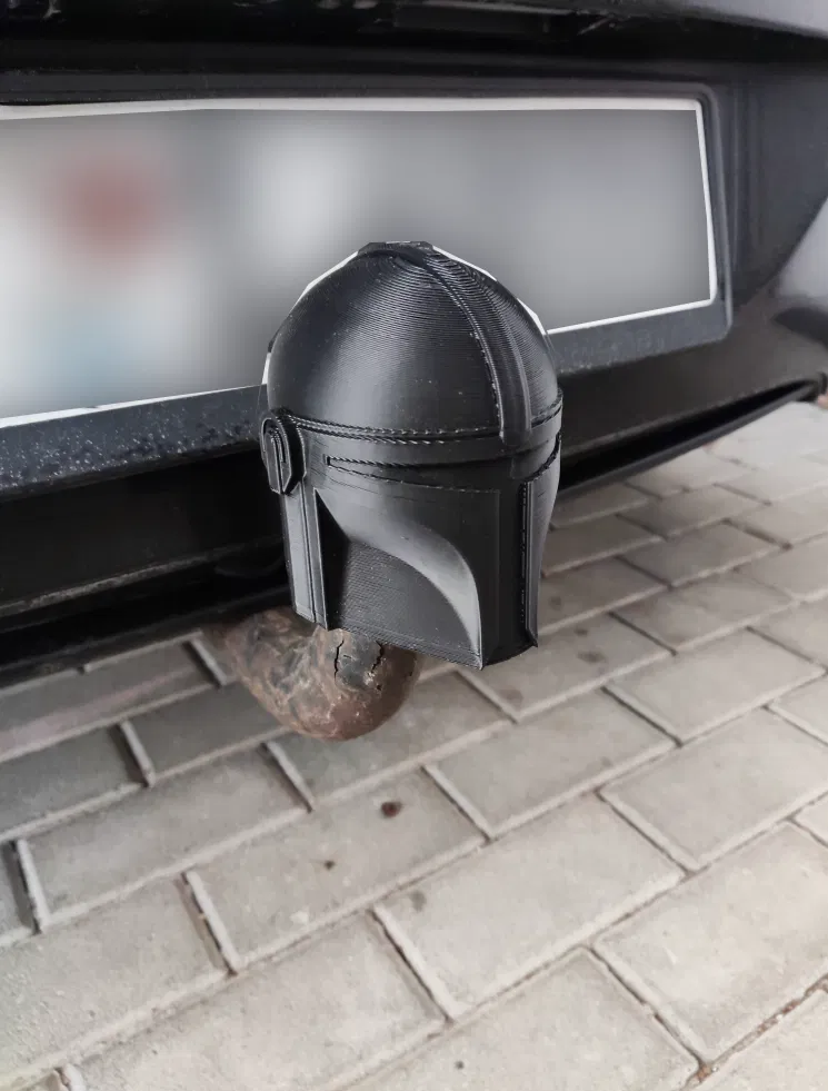 Mẫu nắp che móc kéo (hitch cover) hình nón bảo hiểm Mandalorian. Khi in nên đặt phần đáy xuống (không in theo hướng mặc định trong slicer). Dùng cho móc kéo rơ-moóc kiểu châu Âu.