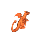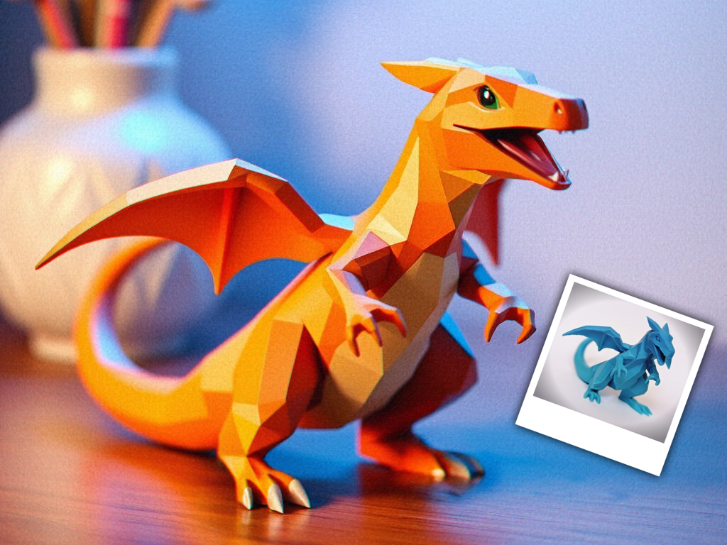 Một mẫu mini Chardizard đơn giản, được tạo bằng AI (hình màu cam) rồi chỉnh sửa lại để in cho chuẩn (hình màu xanh là bản in thật).