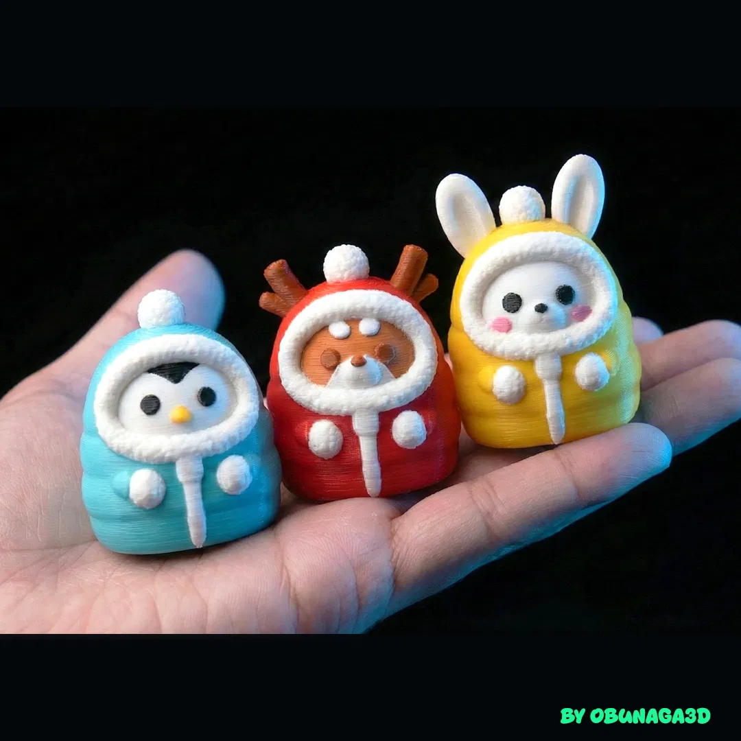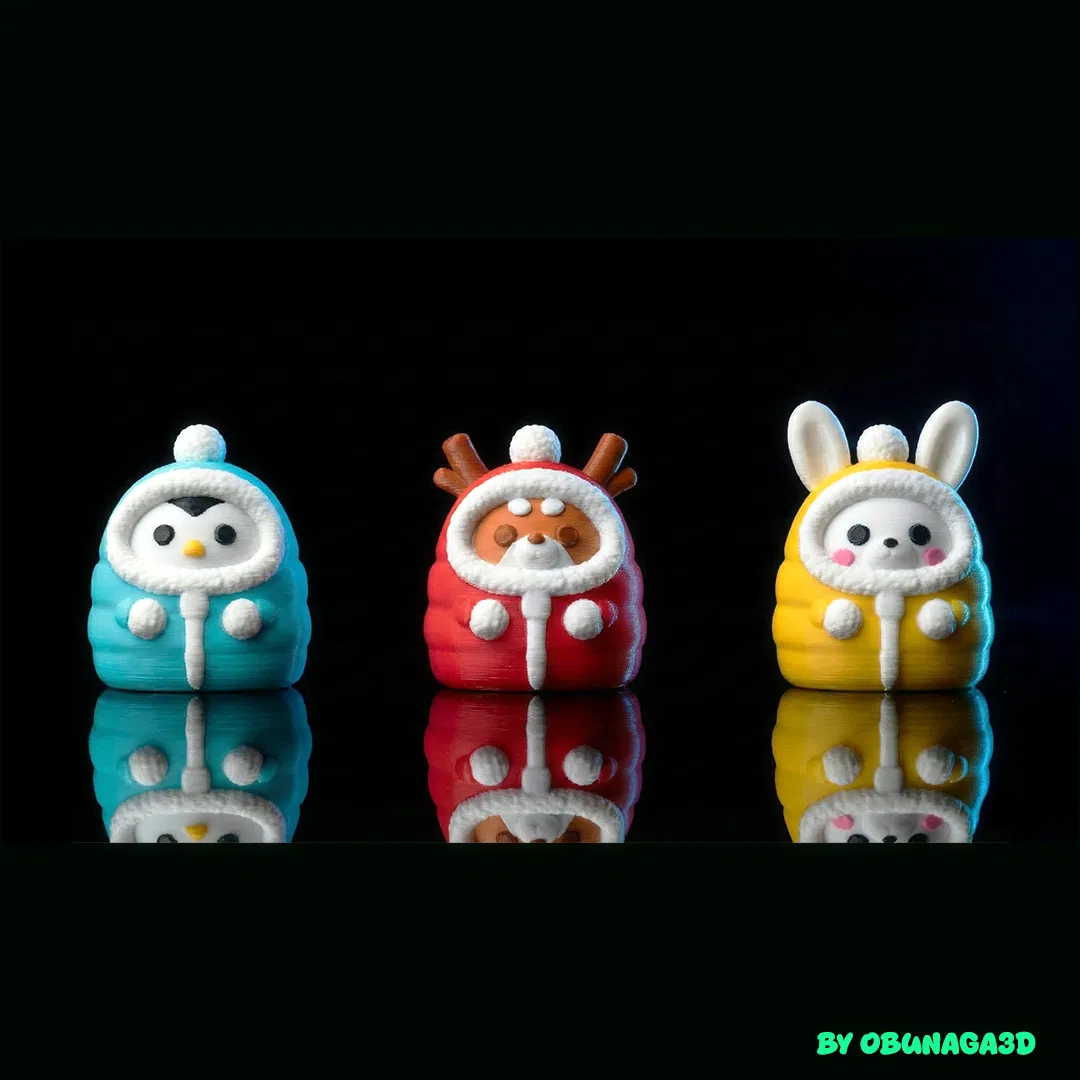 Bộ sưu tập này gồm 3 người bạn ấm áp: một chú Tuần lộc, một chú Chim cánh cụt và một chú Thỏ, tất cả đều quấn trong mũ puffer của mình. Rất hợp để trang trí dịp lễ hoặc đơn giản là làm bạn đồng hành dễ thương trên bàn làm việc.