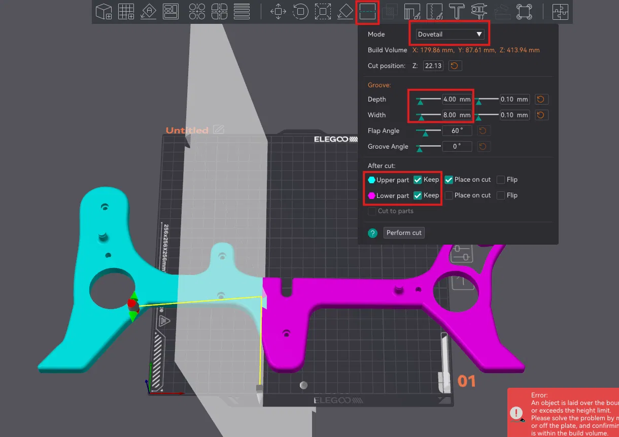 Phần base: nếu bed máy in của bạn không đủ lớn (giống mình) thì mình đã cắt 2 tấm panel bên trong slicer, có dovetail 20 độ. Xem hình.
