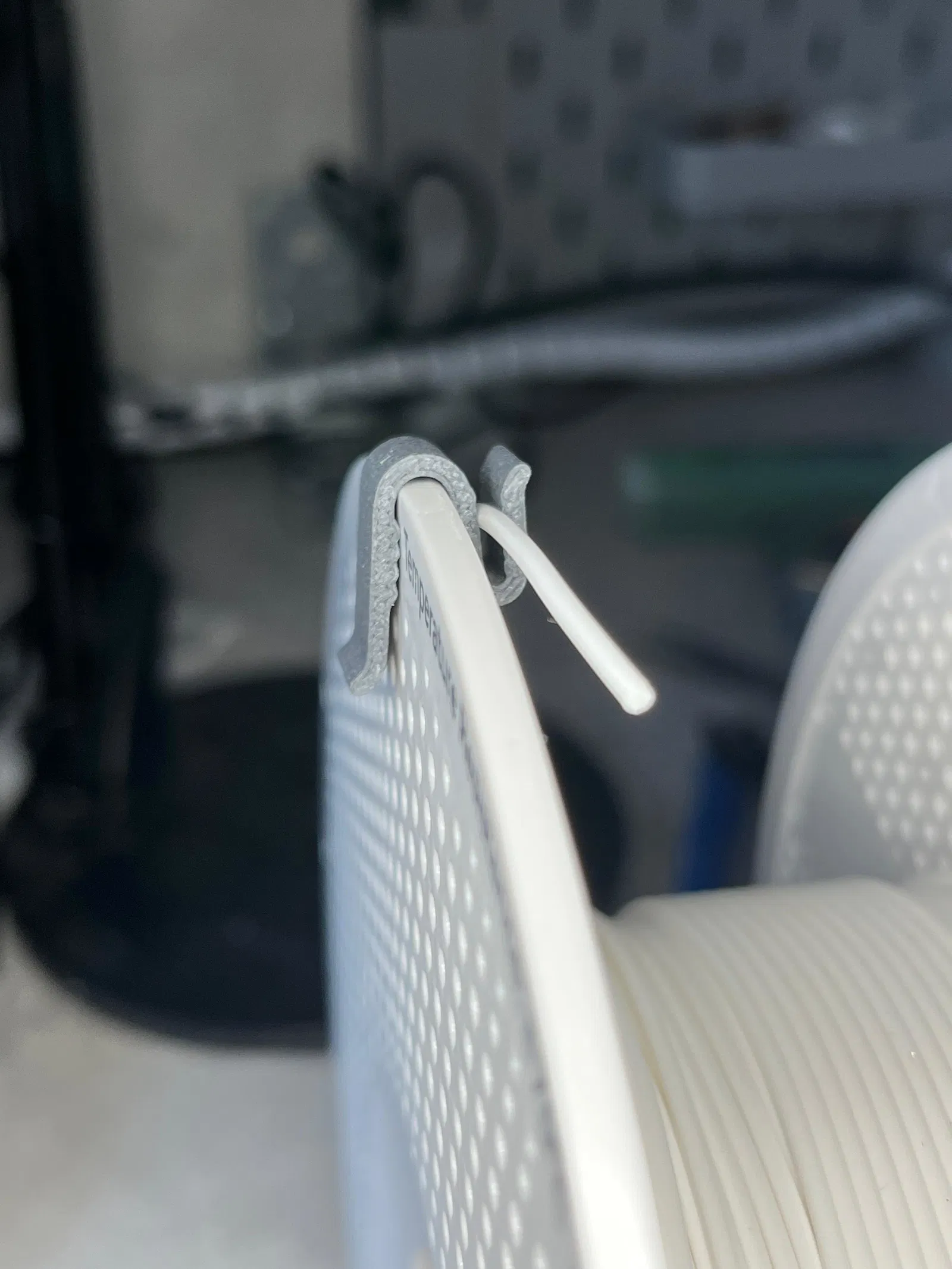 Kẹp chỉ cần bấm (snap) vào mép cuộn filament spool và giữ sợi nhẹ nhàng, không bẻ filament quá gắt.