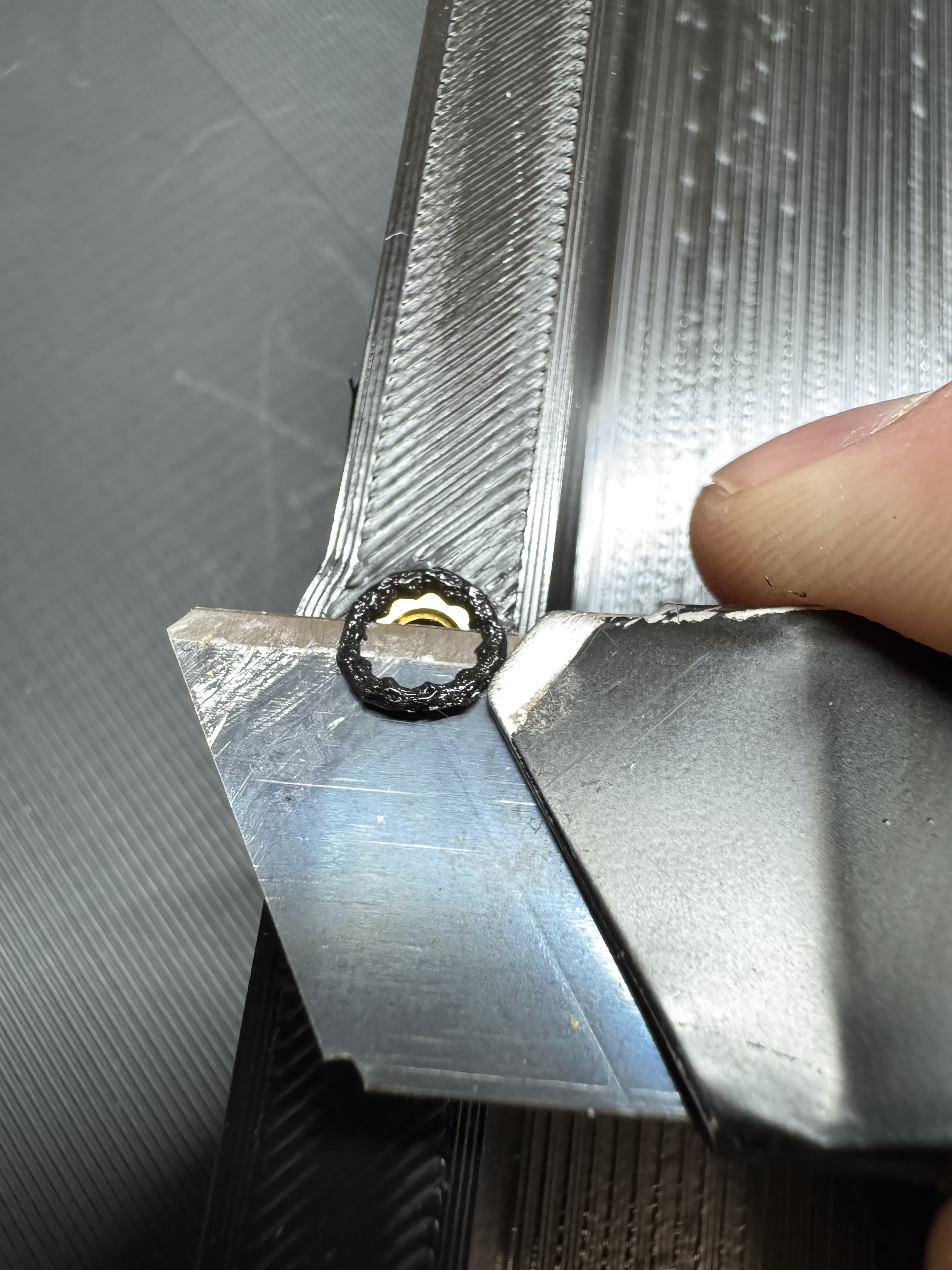 Gọt bỏ phần nhựa dư và làm phẳng bề mặt tiếp xúc. Mình dùng dao rọc giấy và đục, nhưng bạn có thể dùng giấy nhám mịn trên một mặt phẳng. Mục tiêu là loại bỏ các lỗi nhỏ để bề mặt mịn, giúp hạn chế bị rò nước. Bản đầu tiên của mình lỗ hơi nhỏ so với heat inserts nên nhựa bị trồi ra khá nhiều. Version 3 đã chỉnh kích thước tốt hơn và sẽ dễ làm hơn.