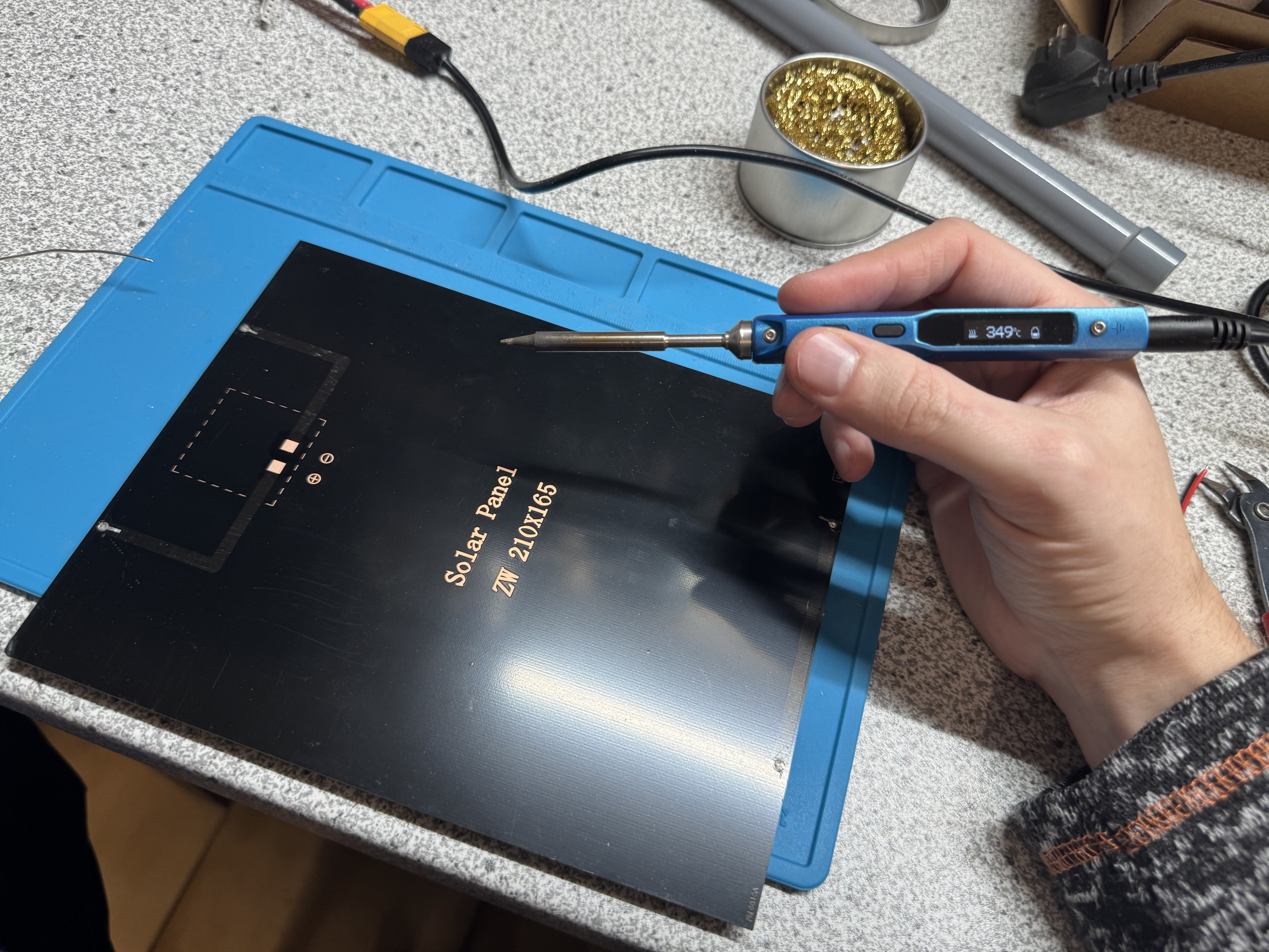 Dùng mỏ hàn gắn hai sợi dây vào tấm pin. Cẩn thận đừng làm nóng tấm pin quá, dễ hư. Nên dùng dây phân màu (đỏ/đen) để sau này nhận biết cực tính.