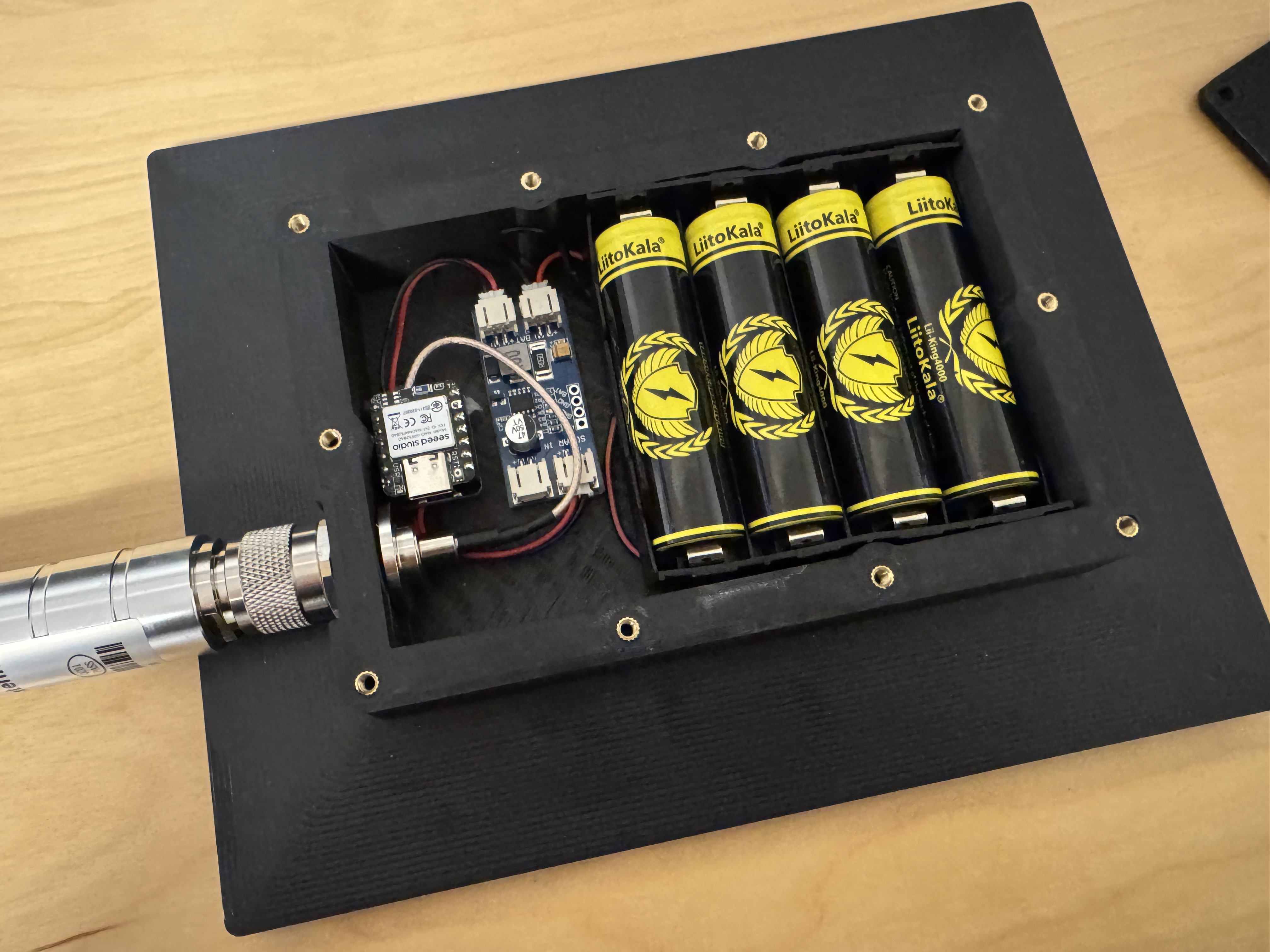 Gắn cáp anten vào SX1262 rồi đặt khay pin và tất cả board vào trong vỏ. Nối dây đúng thứ tự (solar panel -> CN3791, CN3791 -> battery holder, CN3791 -> XIAO nRF). Canh bố trí cho gọn rồi chấm thêm keo nến để cố định linh kiện. Mình không dán chết khay pin trong hộp để còn tháo ra và lấy pin dễ hơn.