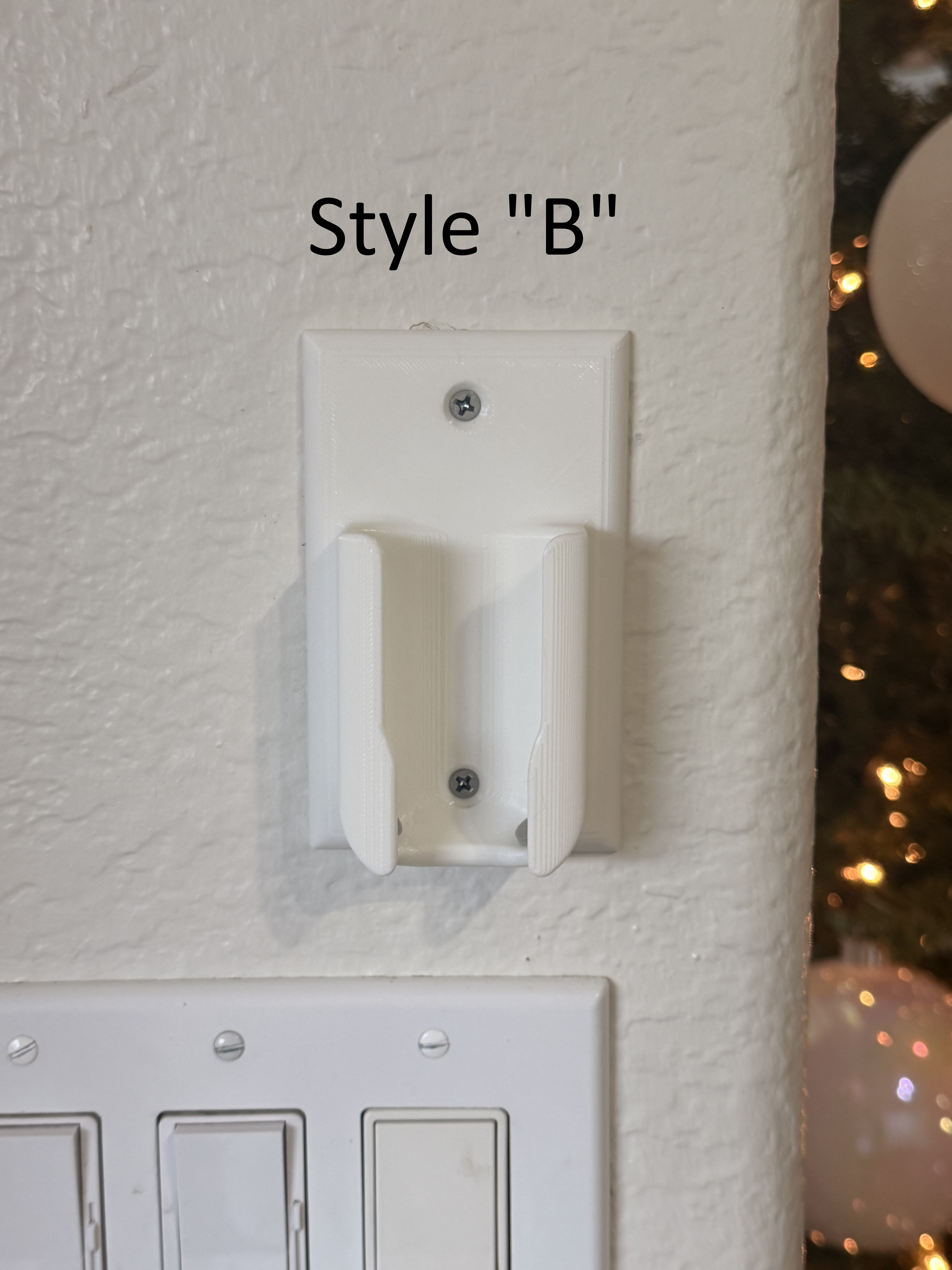 Giá treo remote Roku bắt vít trực tiếp lên wall plate ổ điện, có lỗ gắn vừa hộp điện âm tường chuẩn US. Có 2 kiểu (Style A/B) theo dáng remote và 3 size plate: Standard, Midsize, Jumbo.