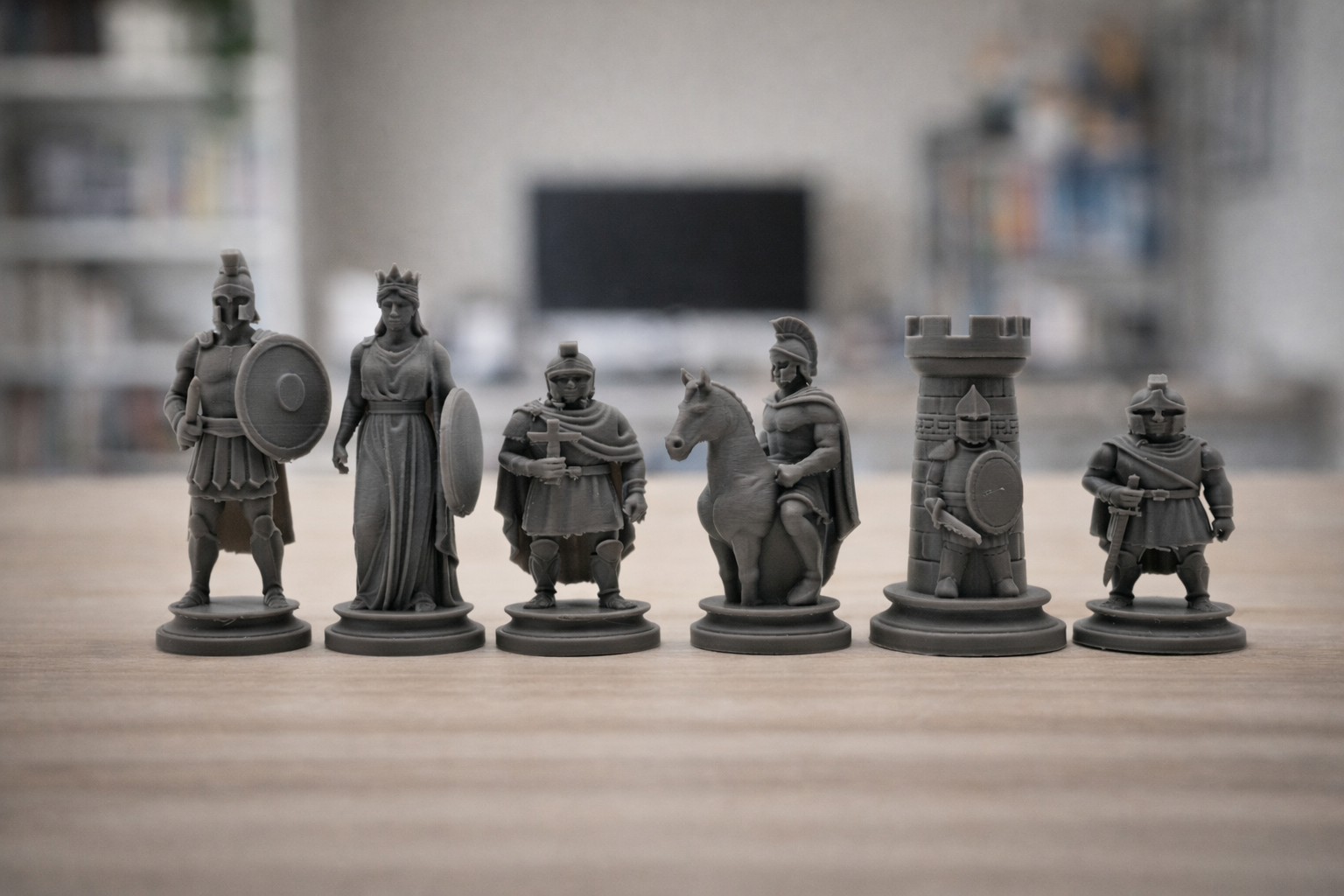 Spartan Chess Set – “THIS IS SPARTA!”. Bộ cờ vua phong cách Spartan với chiều cao quân cờ rõ ràng: King 80mm, Queen 75mm, Bishop/Knight/Rook 60mm, Pawn 50mm. Có link Patreon và tip jar.