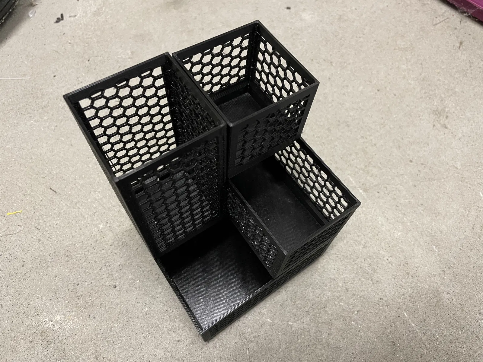 Bộ hộp xếp chồng có các lỗ thoáng dạng lục giác, thiết kế parameterized theo dài–rộng–cao và độ dày thành. Phù hợp để chứa, phân loại các chi tiết nhỏ đã in 3D; in 0.2mm sẽ đẹp hơn.