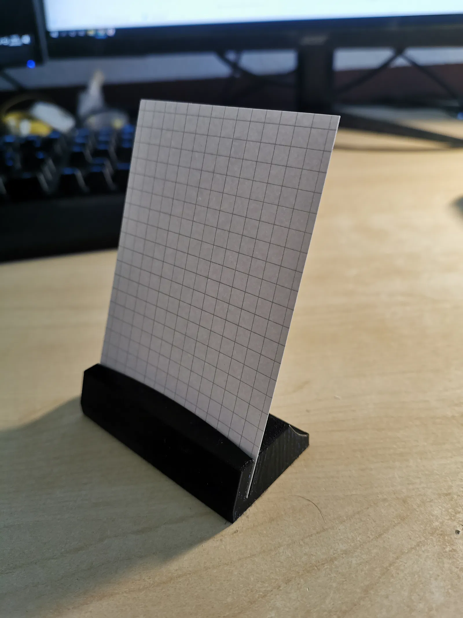Giá đỡ dành cho giấy A7 dùng làm ghi chú. Phần rãnh kẹp hơi cong để giữ tờ giấy đứng vững, tránh bị xẹp. Thiết kế rãnh còn bù chênh lệch độ cao do góc nghiêng và độ cong.
