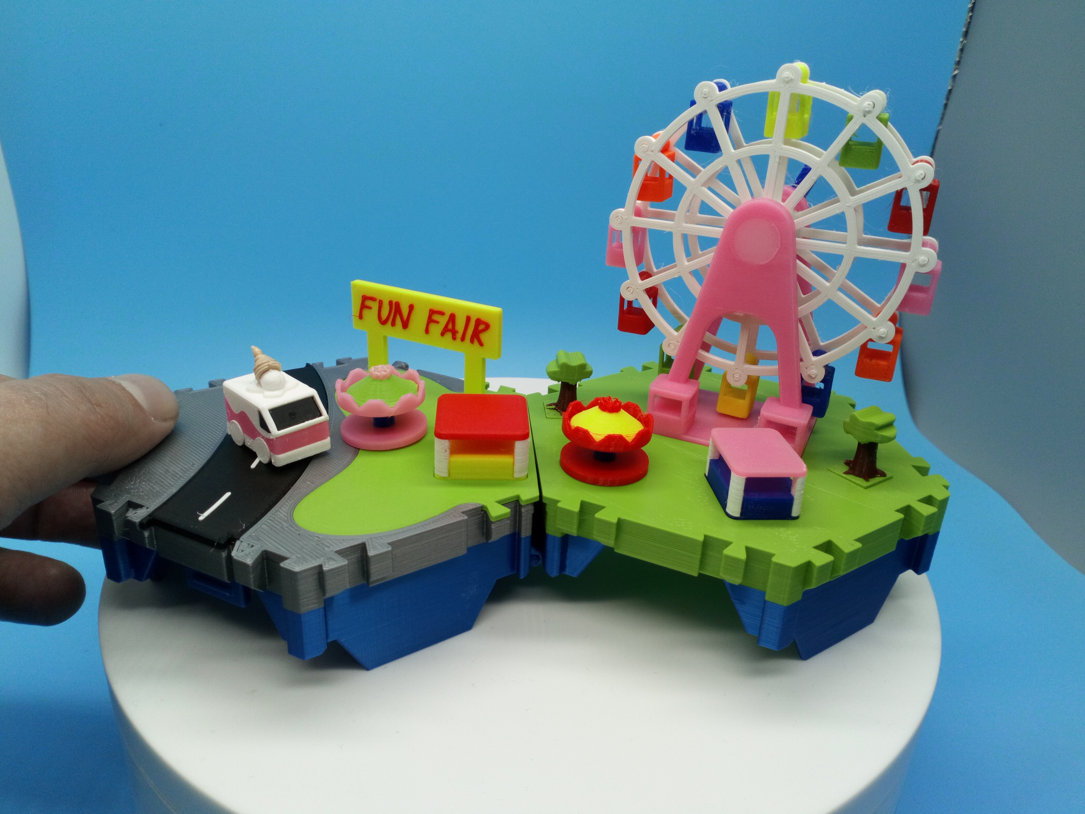 Bộ Little Cities - Fun Fair là playset in 3D gồm case mở bung và các mô hình nhà/xe mini gắn bên ngoài để tạo thành khu hội chợ rực rỡ. Lưu ý bản cập nhật đã bổ sung file STL cây bị thiếu; in theo màu rồi ráp/dán (không MMU).