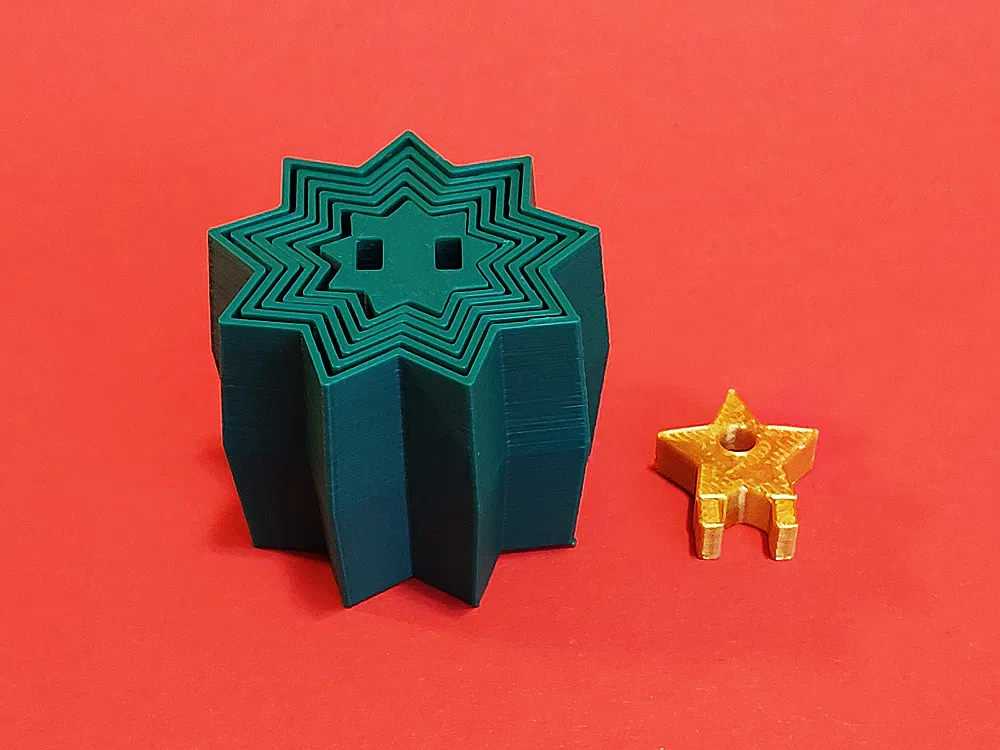 Mình muốn làm một phiên bản nhỏ của mẫu “Christmas Tree Expanding Fidget Toy” của El_Matador08 để bỏ vừa trong hộp quà nhỏ. Mình cắt bớt các phần cho tới khi đạt kích thước mong muốn. Sau đó mình kéo giãn từng đoạn để chúng cao hơn, nên tổng thể cây cũng cao hơn. Vì mình không có AMS và cũng không muốn đổi filament giữa chừng khi in, mình thiết kế ngôi sao thành một chi tiết rời (nó gắn vào phần trên/giữa bằng hai lỗ socket). Rồi mình thêm lỗ xỏ dây/móc treo lên ngôi sao, để có thể treo lên cây thông Noel như một món ornament.