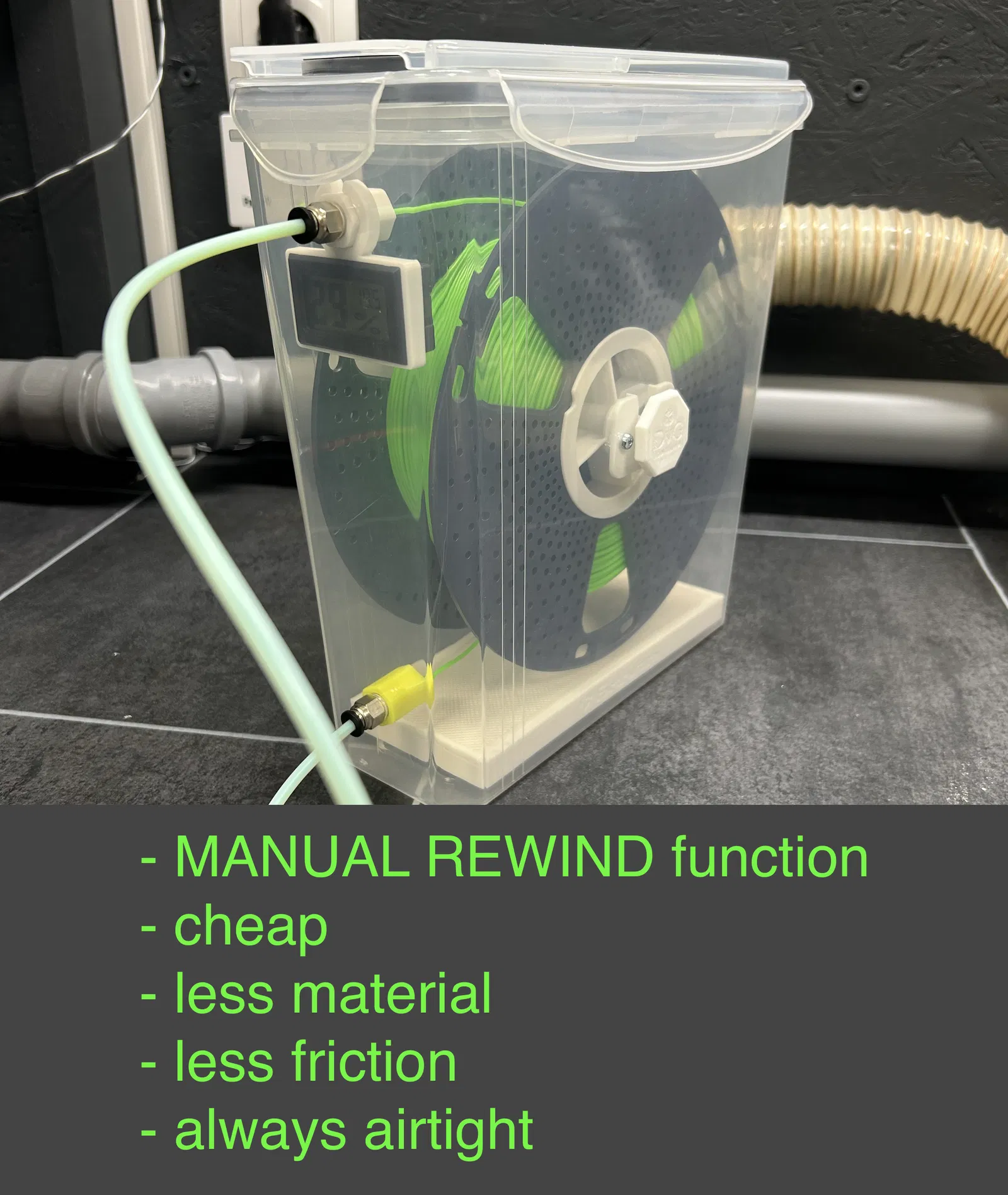 Bộ drybox cho hộp cereal: chi phí thấp, in nhanh, kín khí, có chức năng MANUAL REWIND để cuộn lại filament. Hỗ trợ nhiều loại spool (đặc biệt Sunlu Gen2/Gen3), kèm danh sách vật tư và hướng dẫn lắp ráp chi tiết.