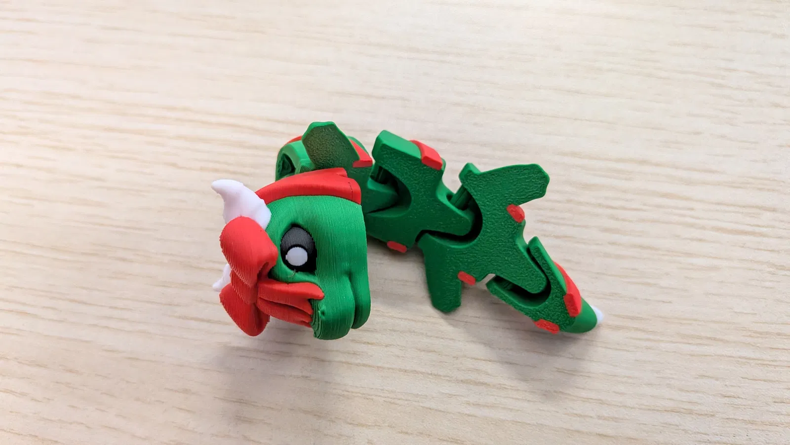 Gift Dragon là chú rồng móc khóa khớp nối (articulated) uốn dẻo mượt, được quấn ruy băng đỏ siêu Noel. Vừa fidget toy đã tay vừa trang trí dễ thương. Tải STL & 3MF và in với layer 0.2 mm.