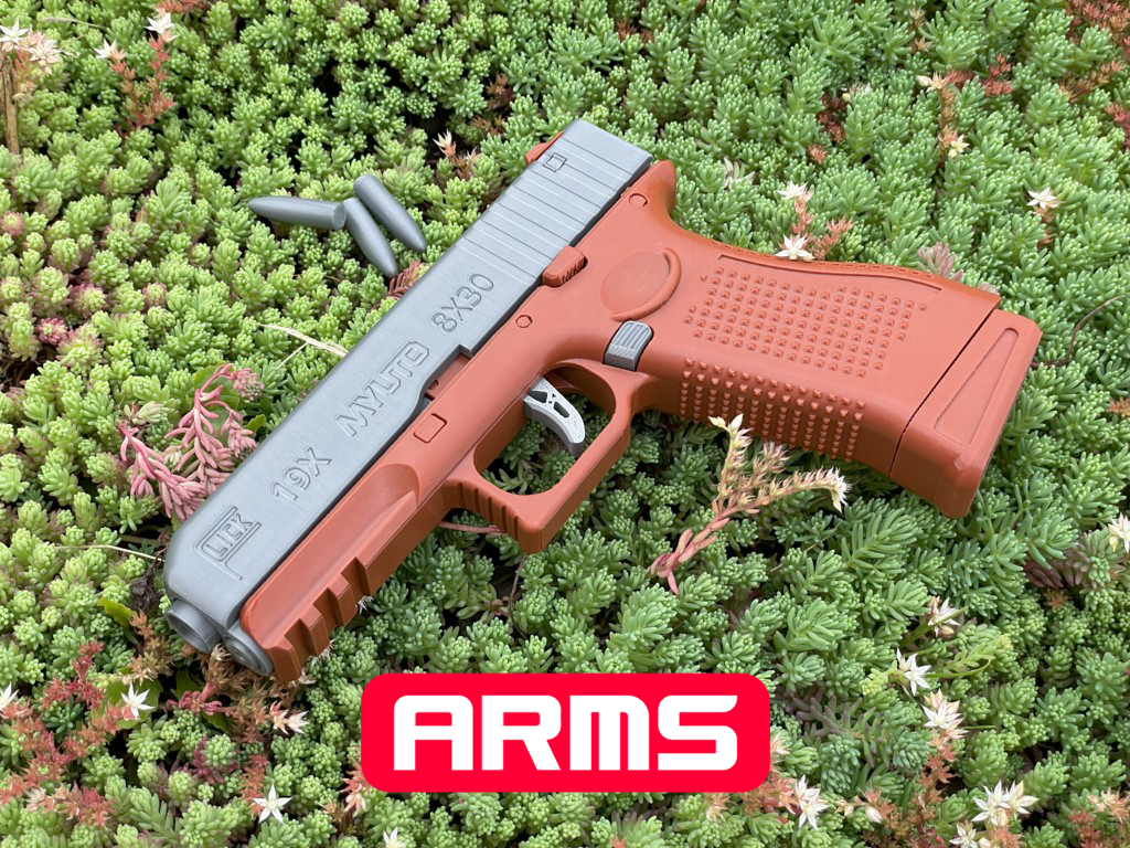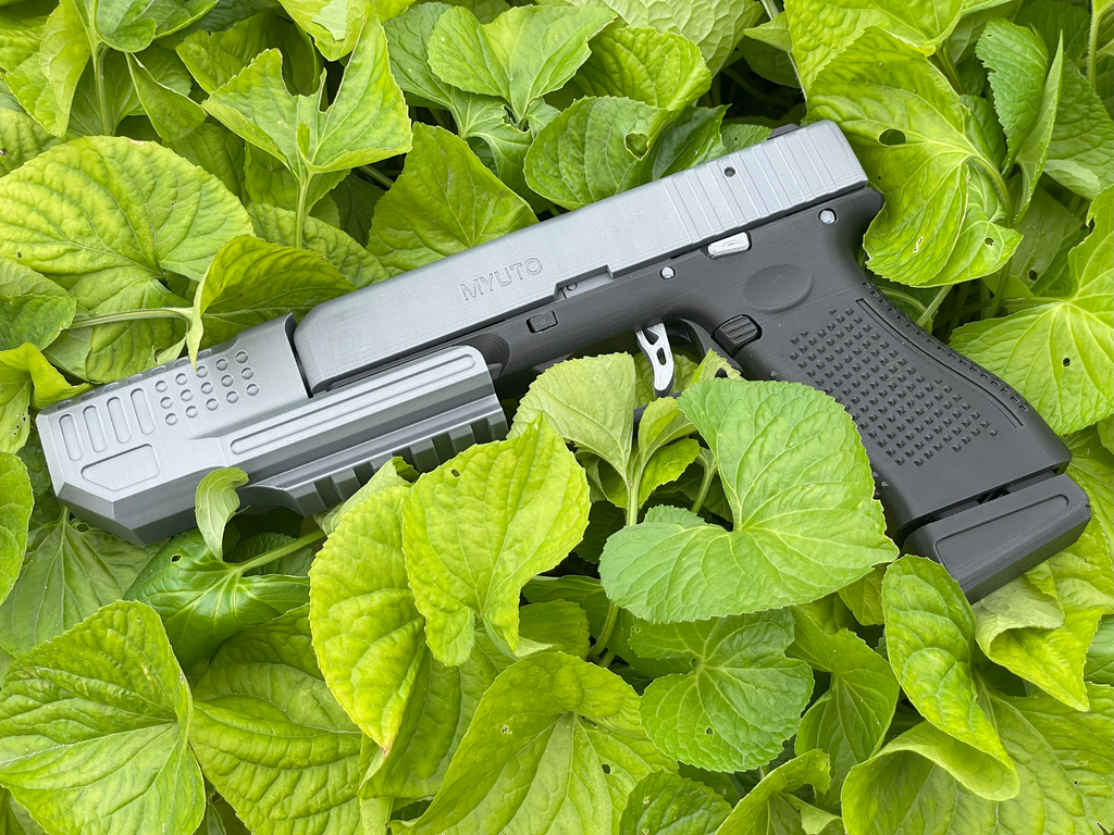 Myuto Flick 19X là mẫu súng đồ chơi cơ khí dạng slingshot gun bắn thun, có khóa slide tự động khi mag hết và thiết kế tối ưu cho in 3D (ít supports, dung sai rộng). File tải về nằm trong .zip.
