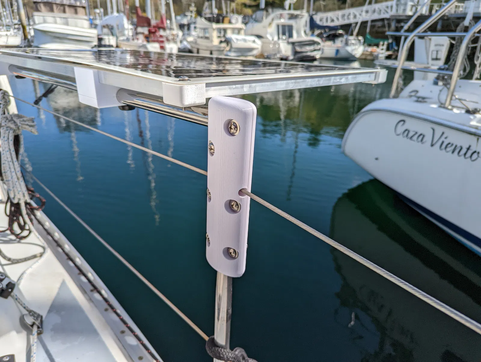 Bộ chi tiết in 3D để gắn flexible solar panel lên ống inox 1" trên hệ stanchion/lifeline của thuyền buồm. Gồm corner pieces tạo khung bằng ống nhôm vuông ¾", kẹp mounting clamps lên rail, và tùy chọn stanchion extender.