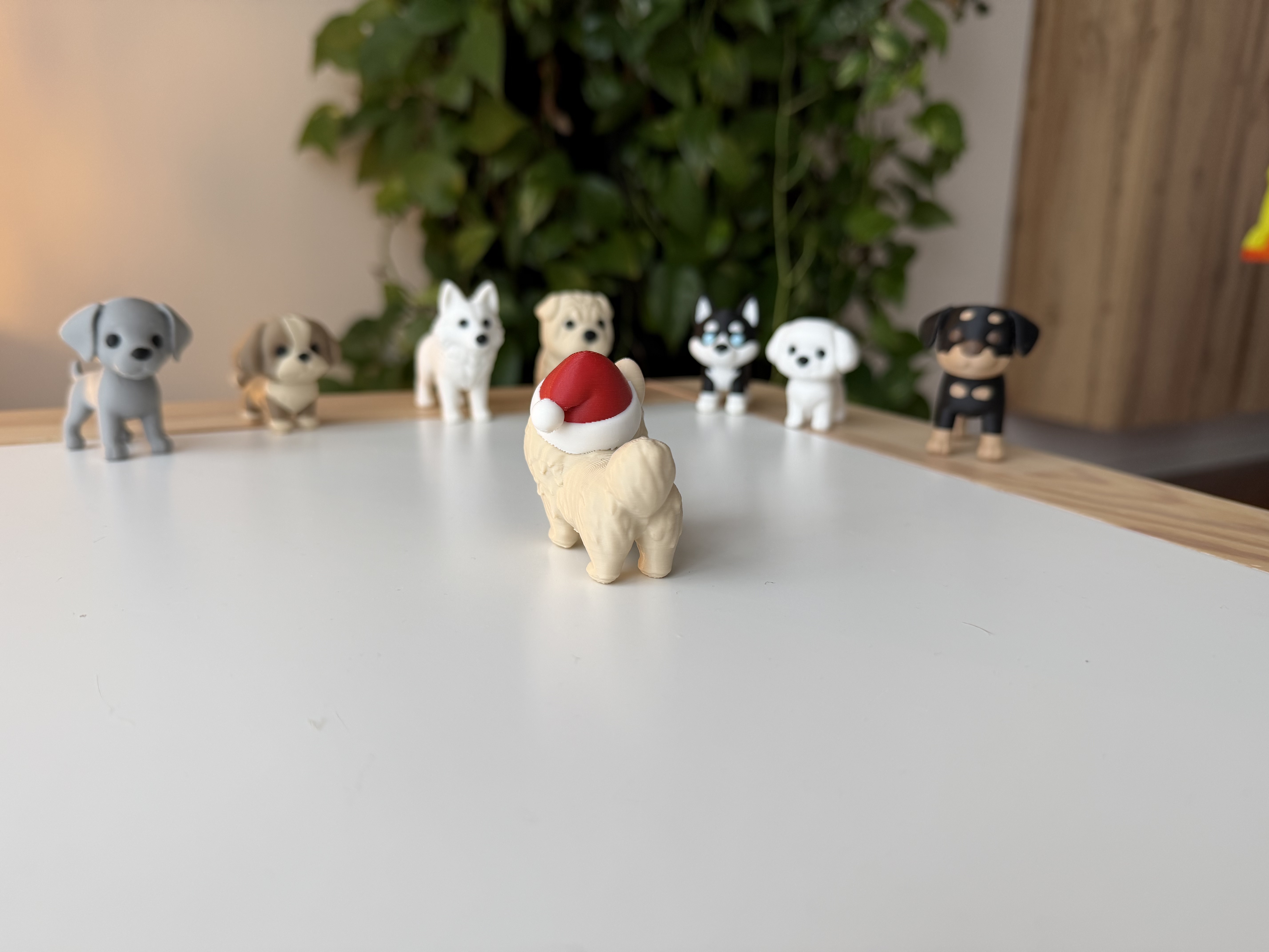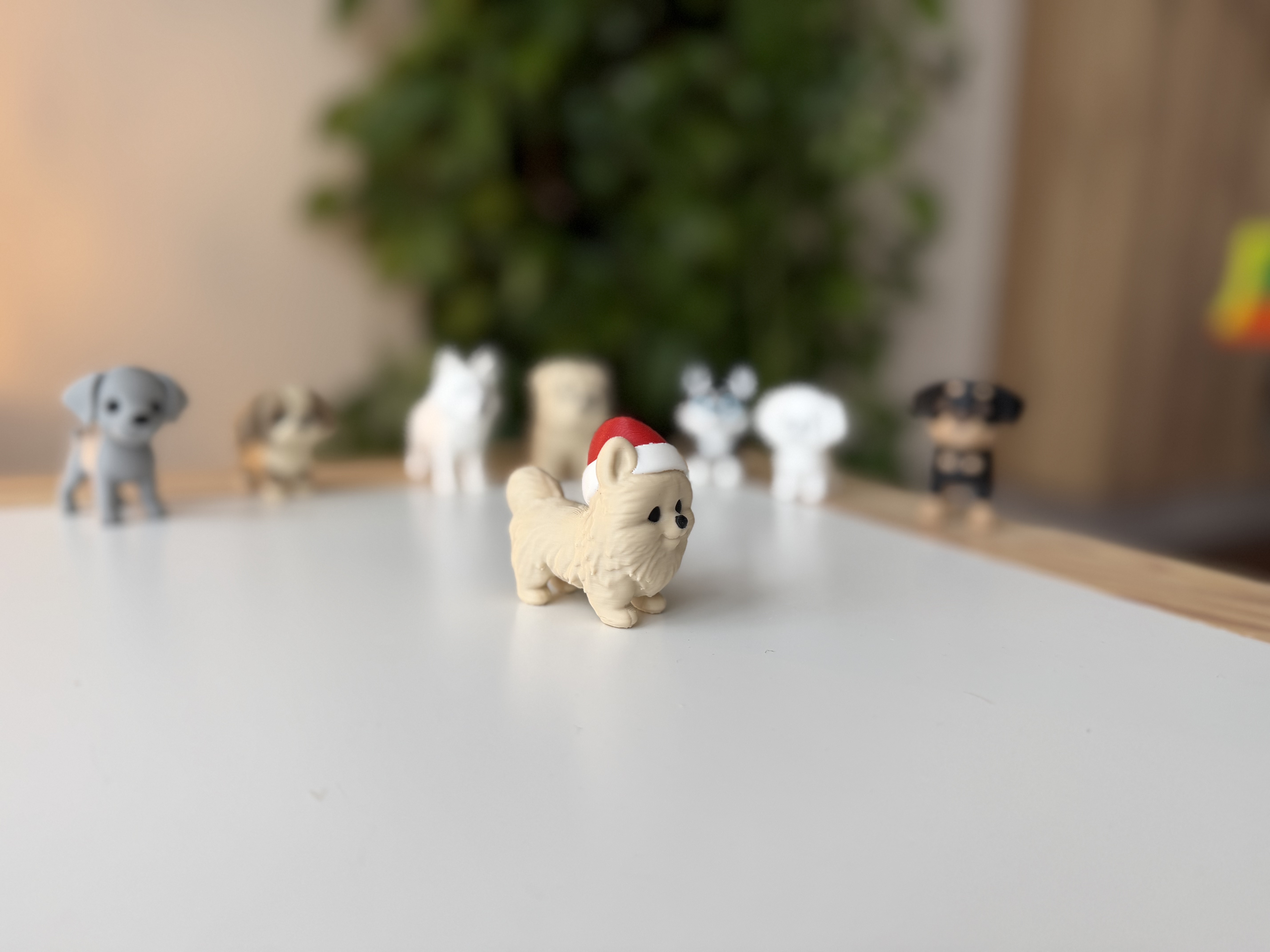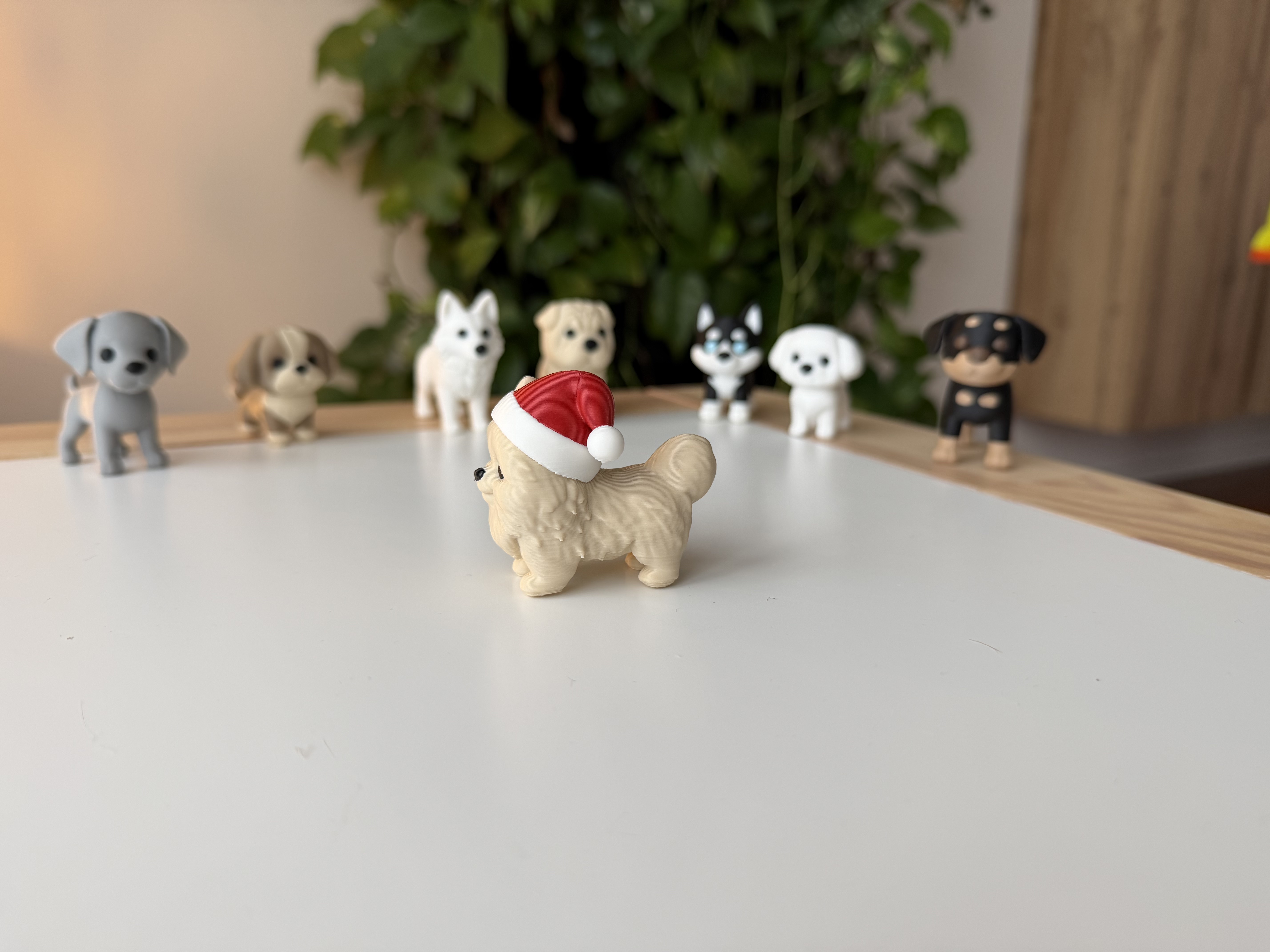 Mẫu Pomeranian đội mũ Giáng Sinh siêu dễ thương: dáng nhỏ gọn, lông xù bồng bềnh, mắt sáng lanh lợi. Rất hợp để in 3D trang trí Noel, làm quà tặng hoặc chụp hình décor mùa lễ.